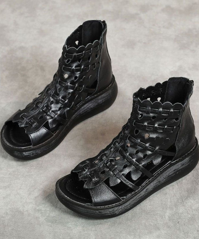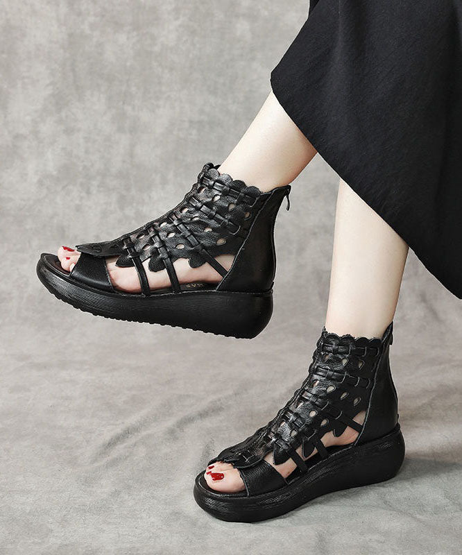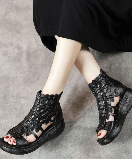 Black Cowhide Leather Hollow Out Splicing Peep Toe Platform Sandals