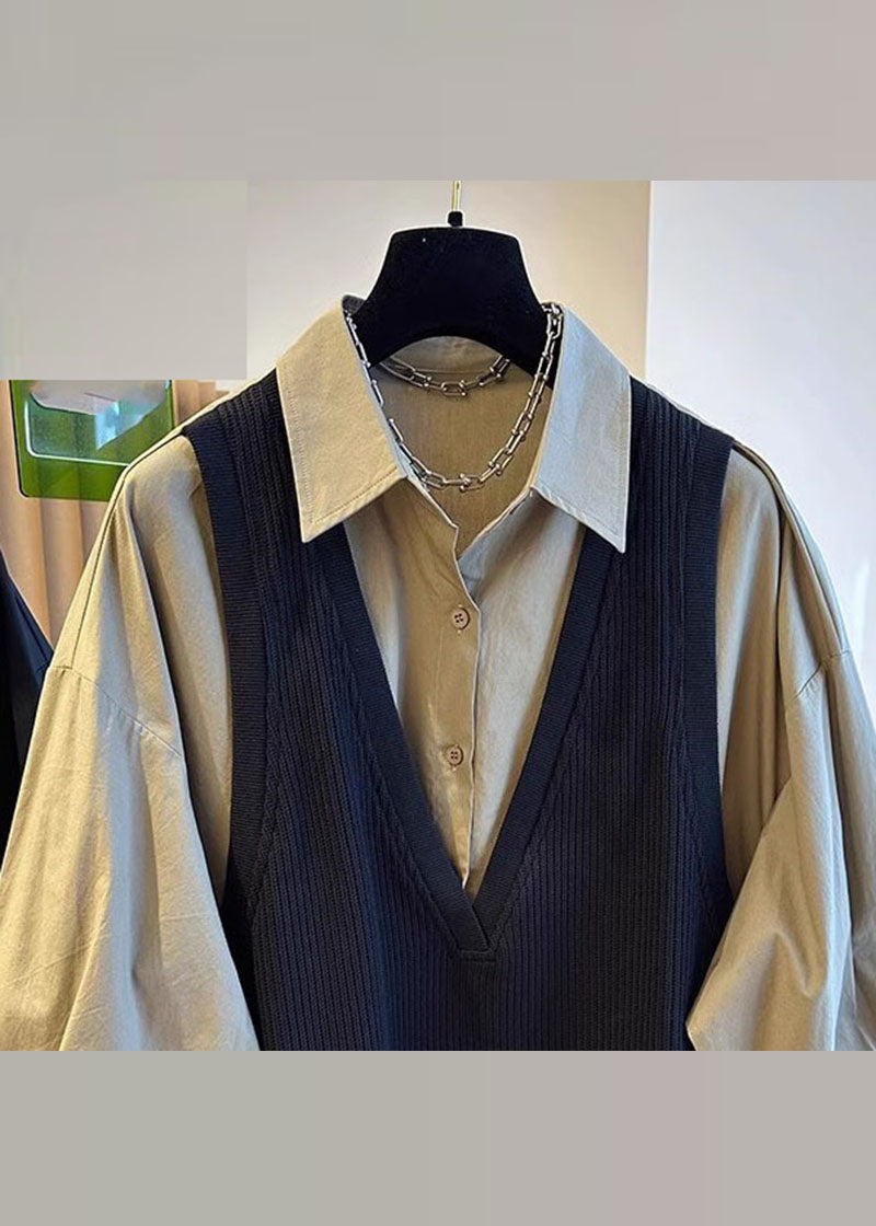 Bohemian Khaki Peter Pan Collar Patchwork Button Fake Two Pieces Shirts Fall