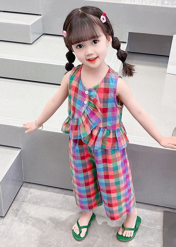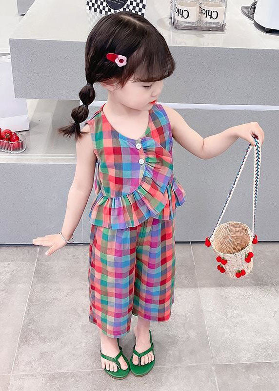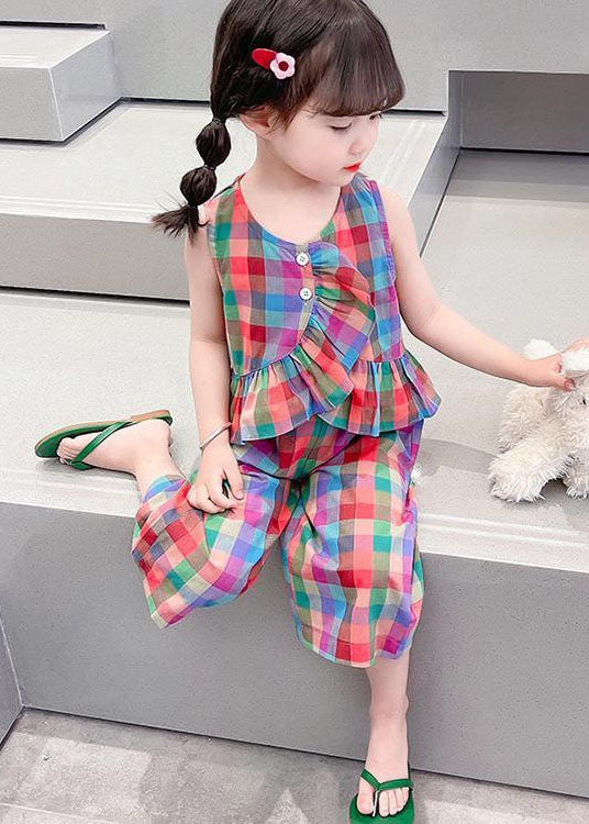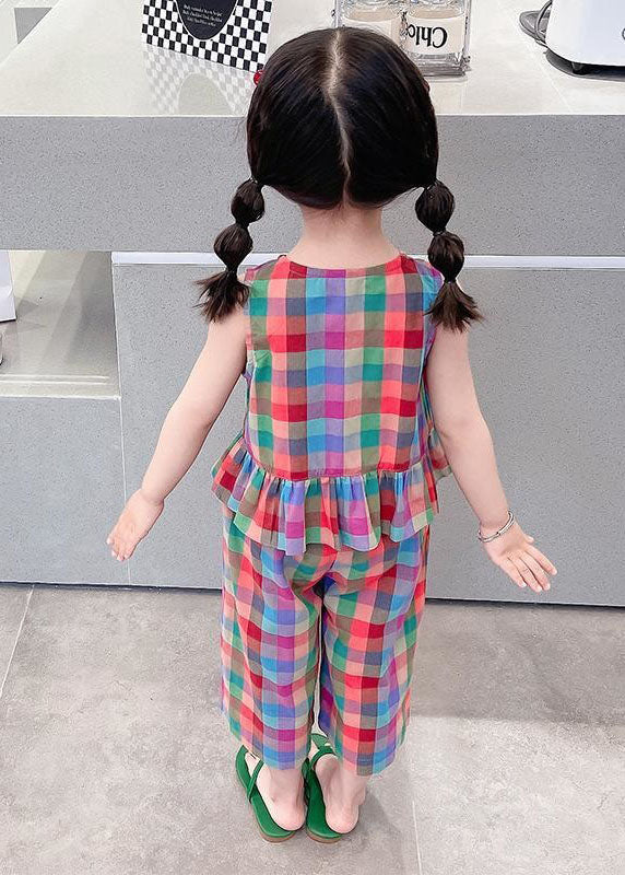 Boutique Plaid Ruffled Tops And Pants Cotton Kids Girls Two Pieces Set Sleeveless