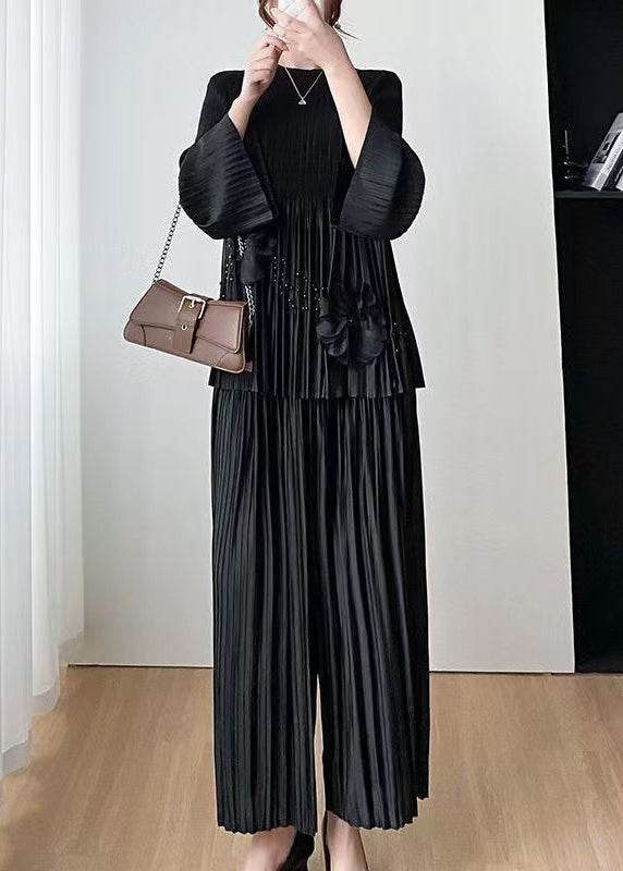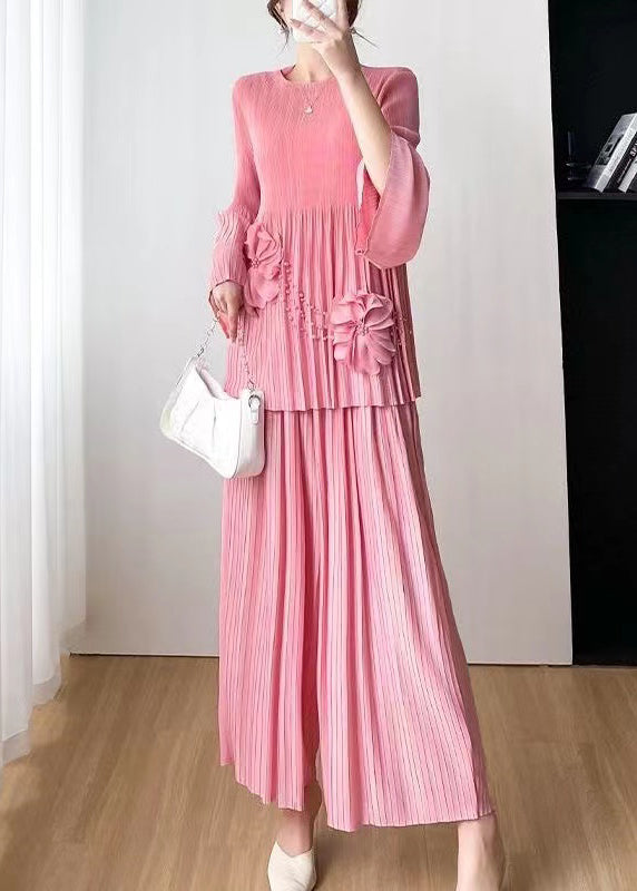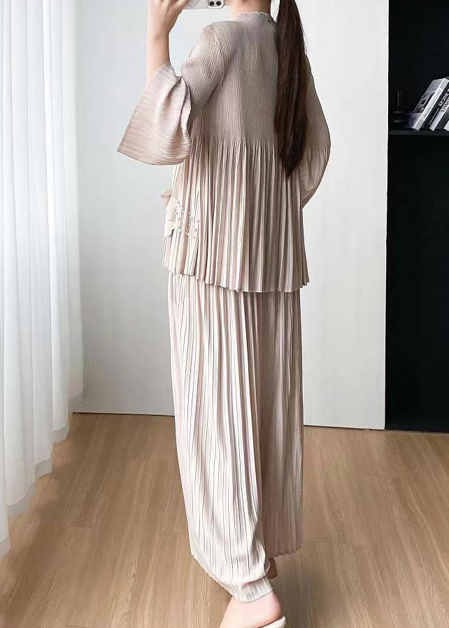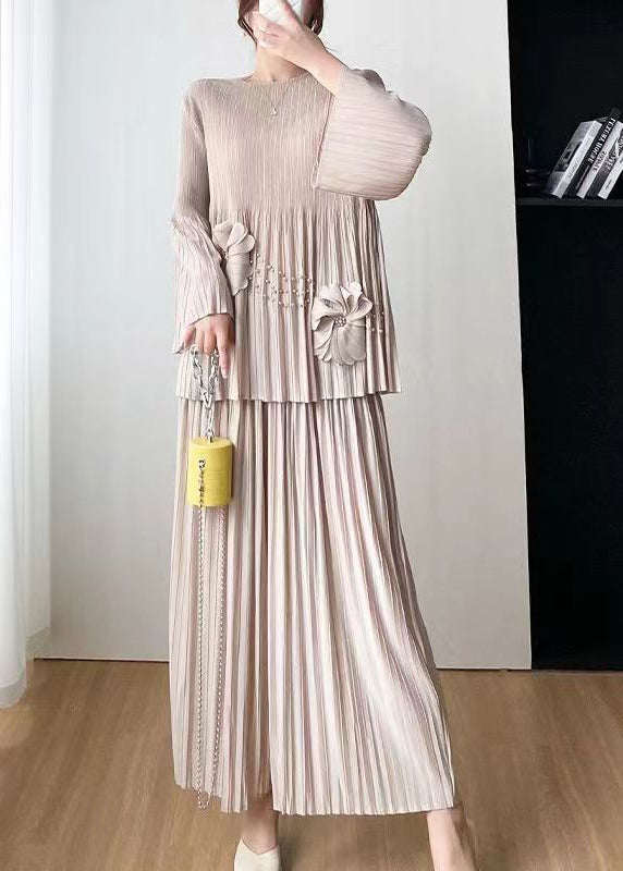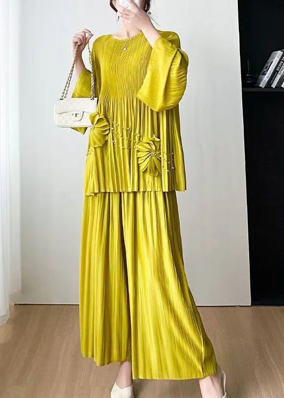 Boutique Yellow Green O Neck Nail Bead Wrinkled Loose Silk Two Pieces Set Spring