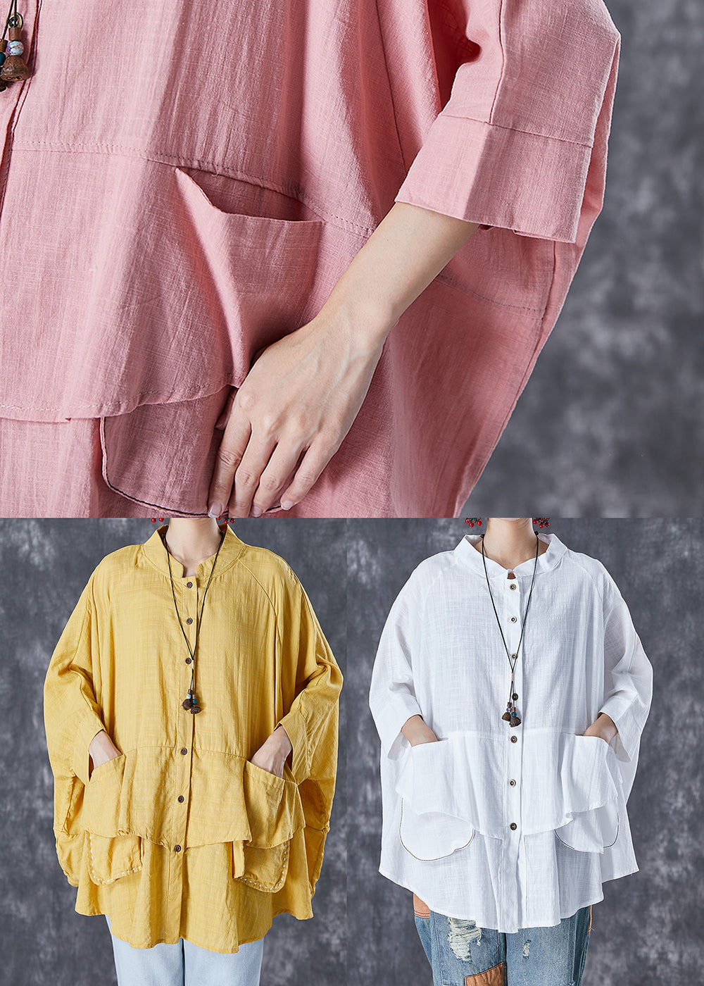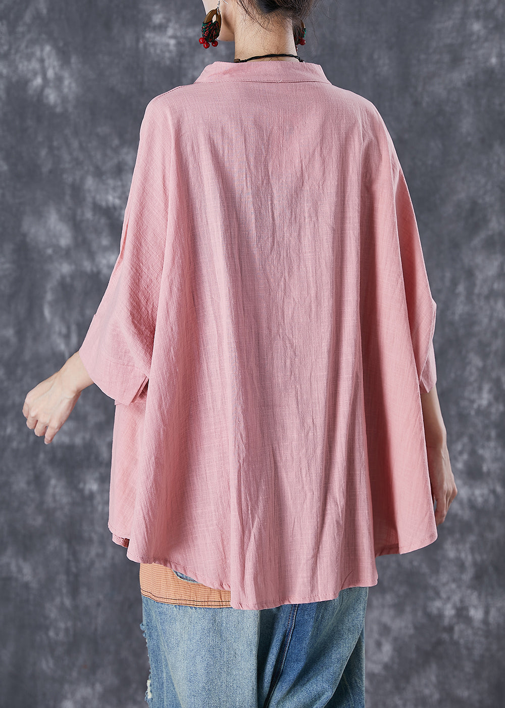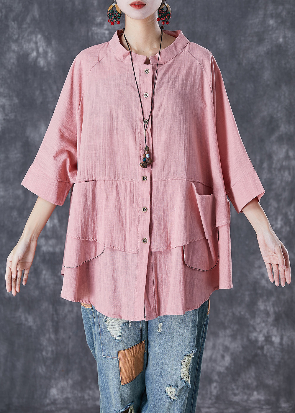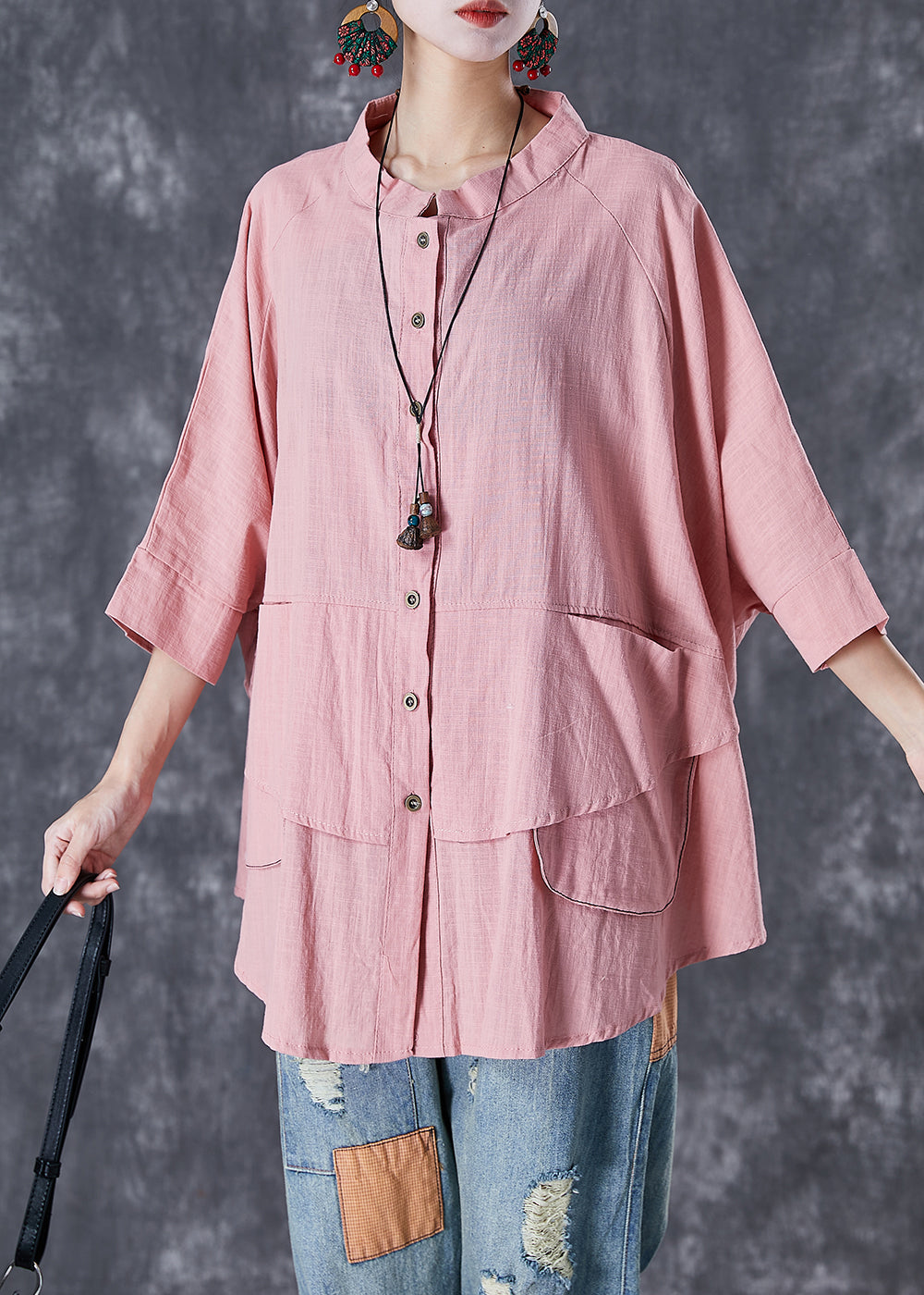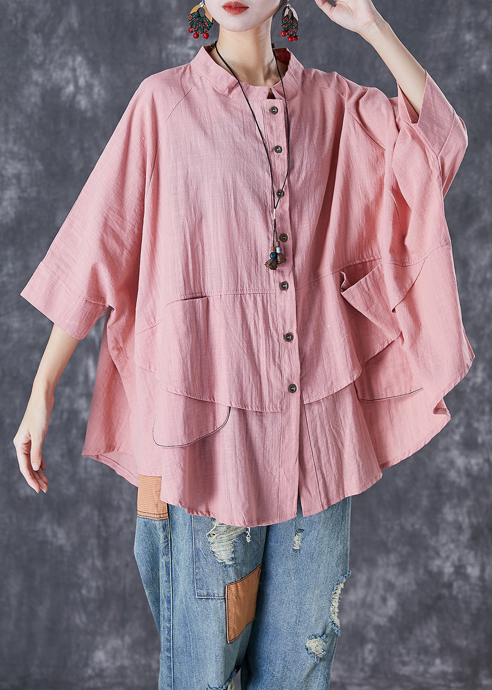 Casual Pink Button Down Pockets Linen Blouses Batwing Sleeve