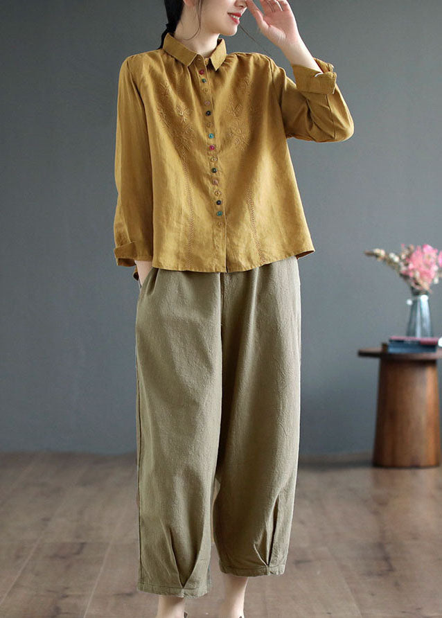 Casual Yellow Peter Pan Collar Embroideried Linen Blouse Tops Fall