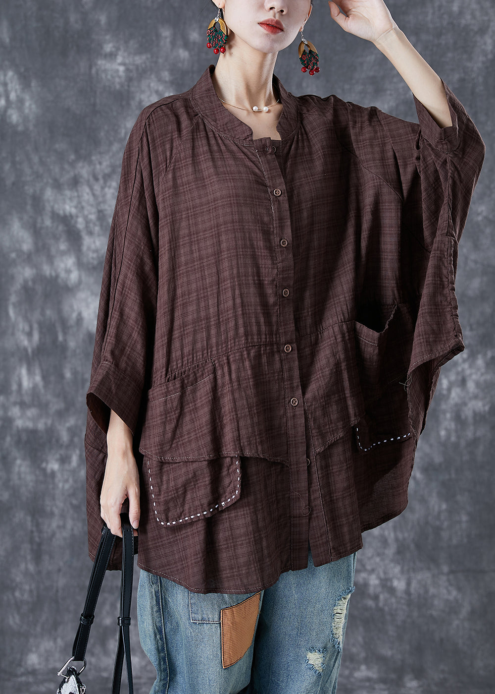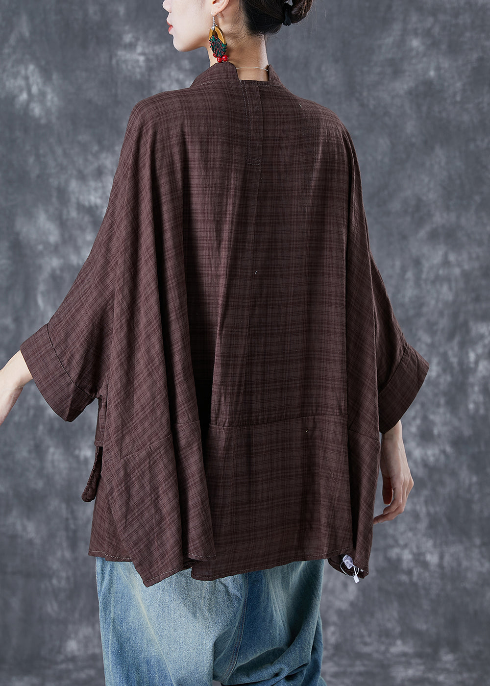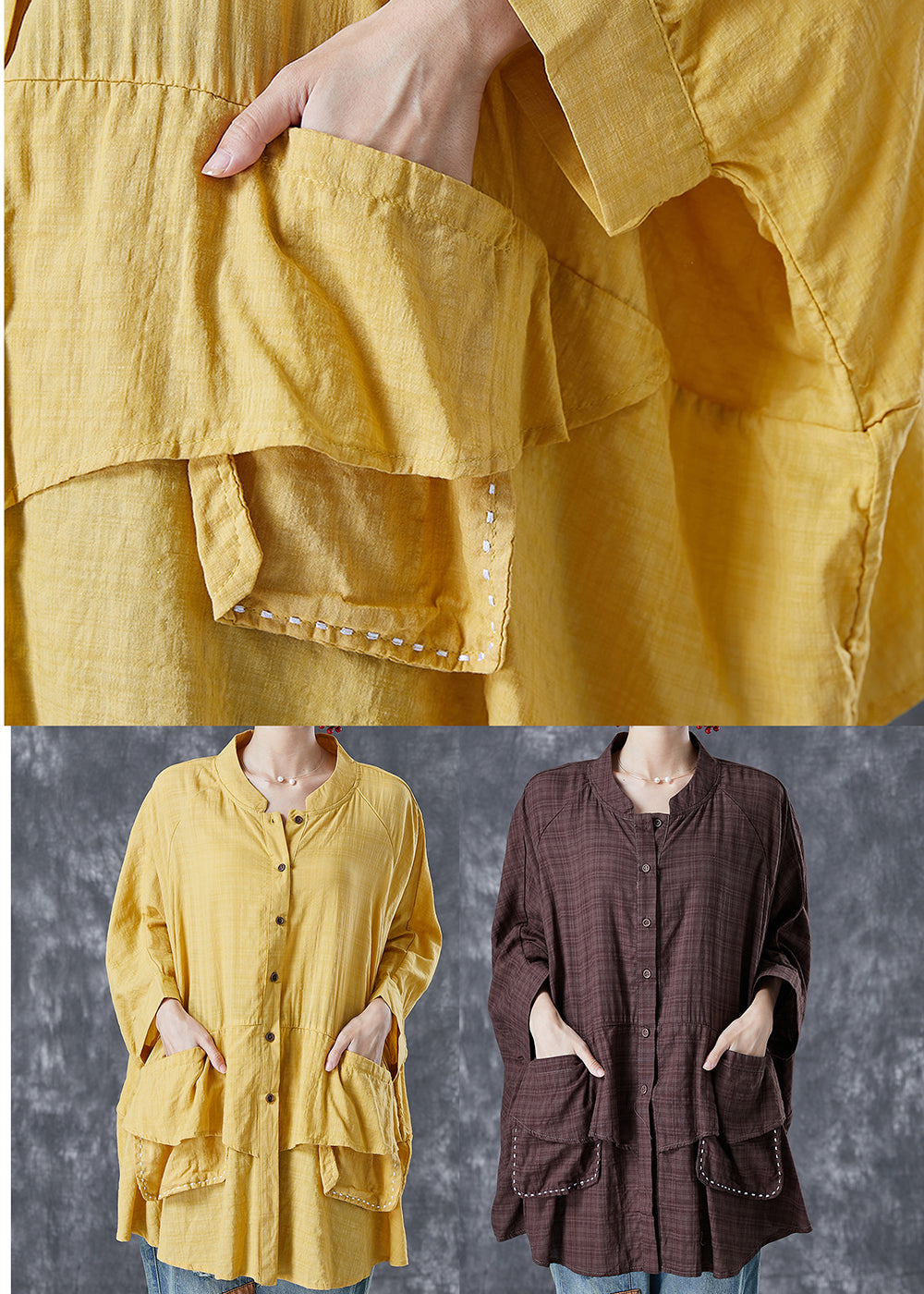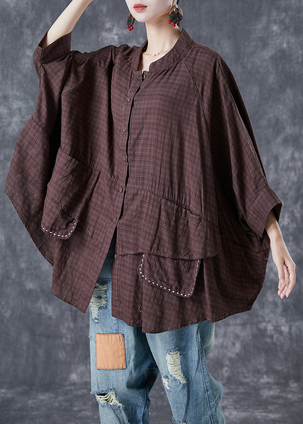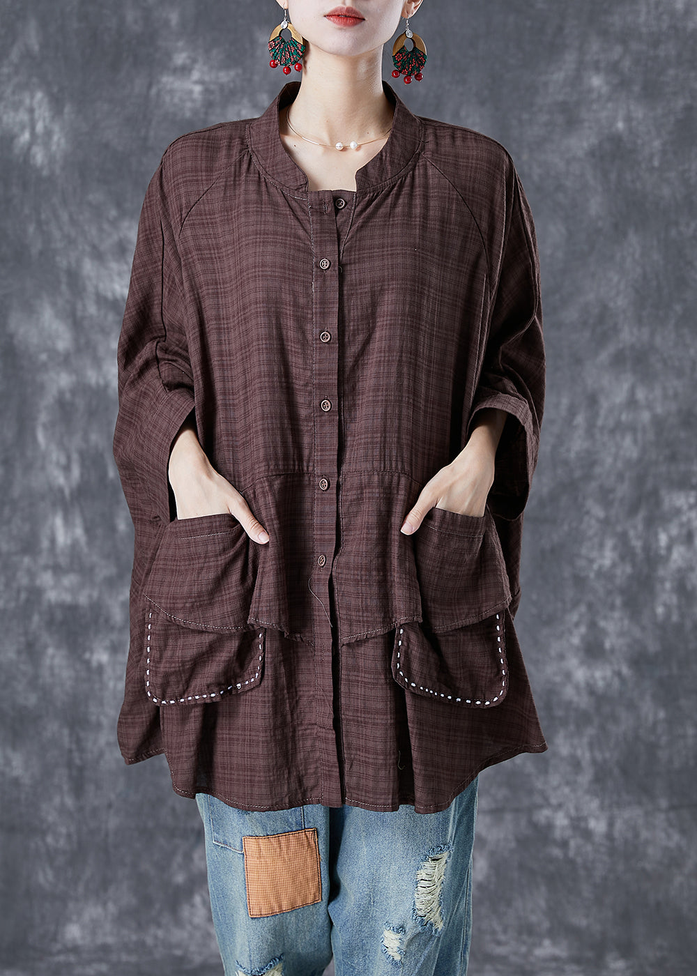 Chocolate Loose Linen Shirt Stand Collar Pockets Batwing Sleeve