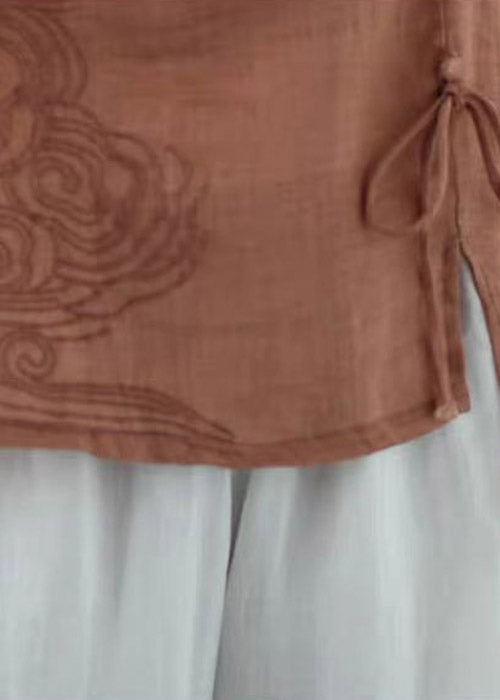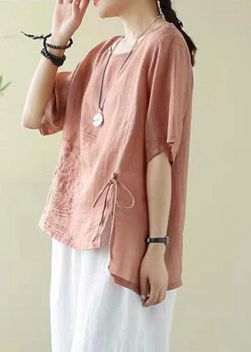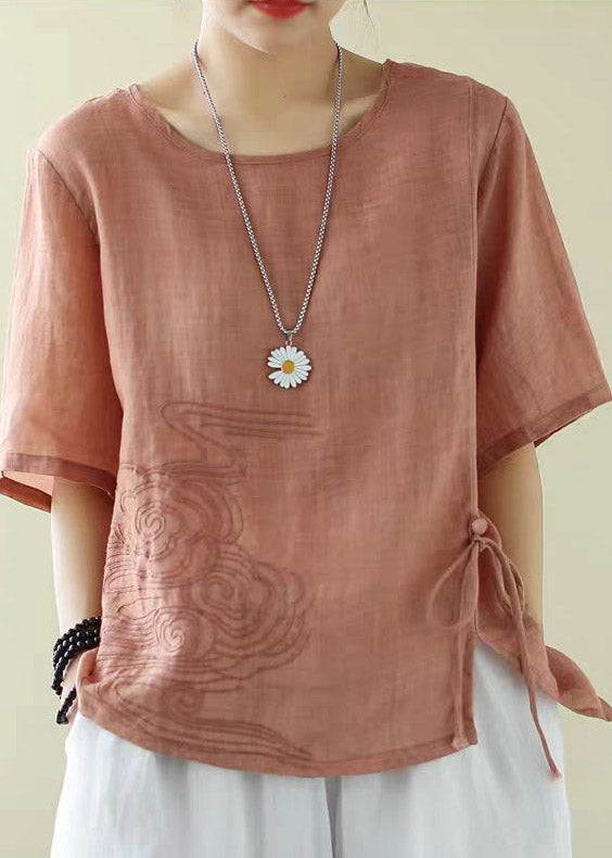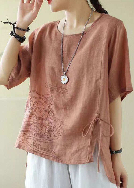 Classy Orange O-Neck Embroideried Drawstring low high design Cotton Tops Short Sleeve
