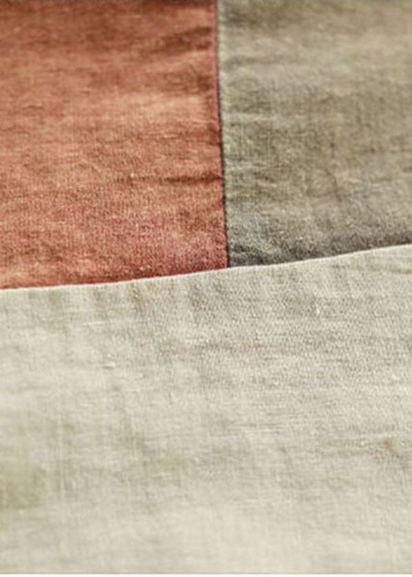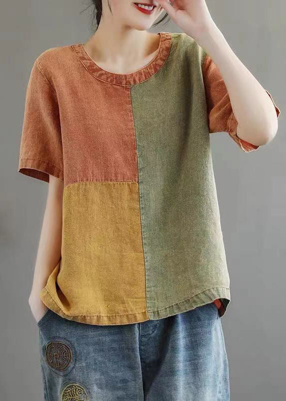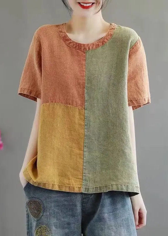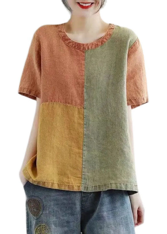 DIY Orange O-Neck Patchwork Original Design Linen Tank Top Short Sleeve