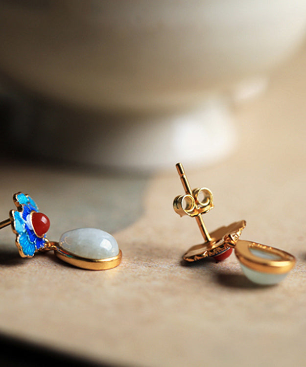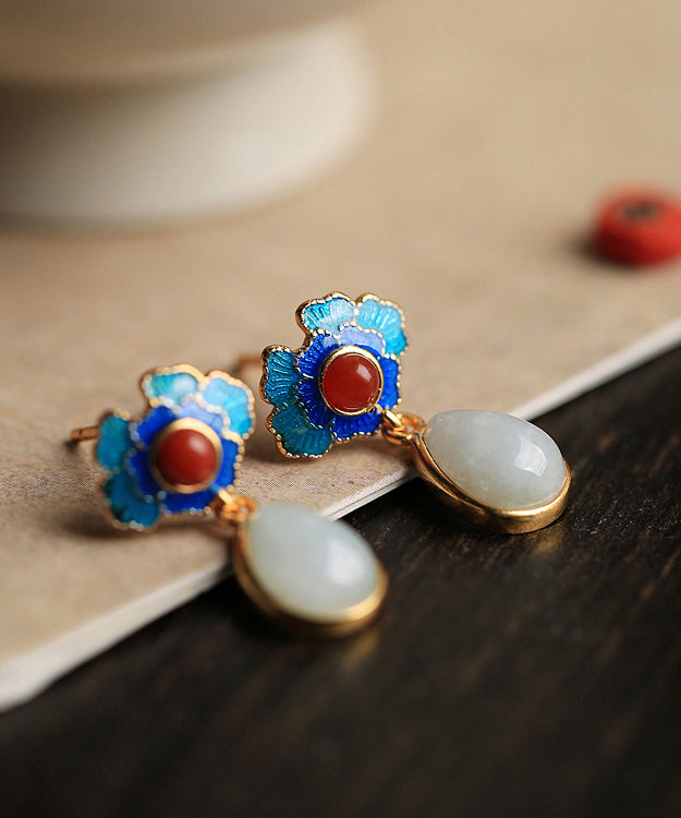 Fashion Blue Floral Sterling Silver Jade Jadeite Stud Earrings