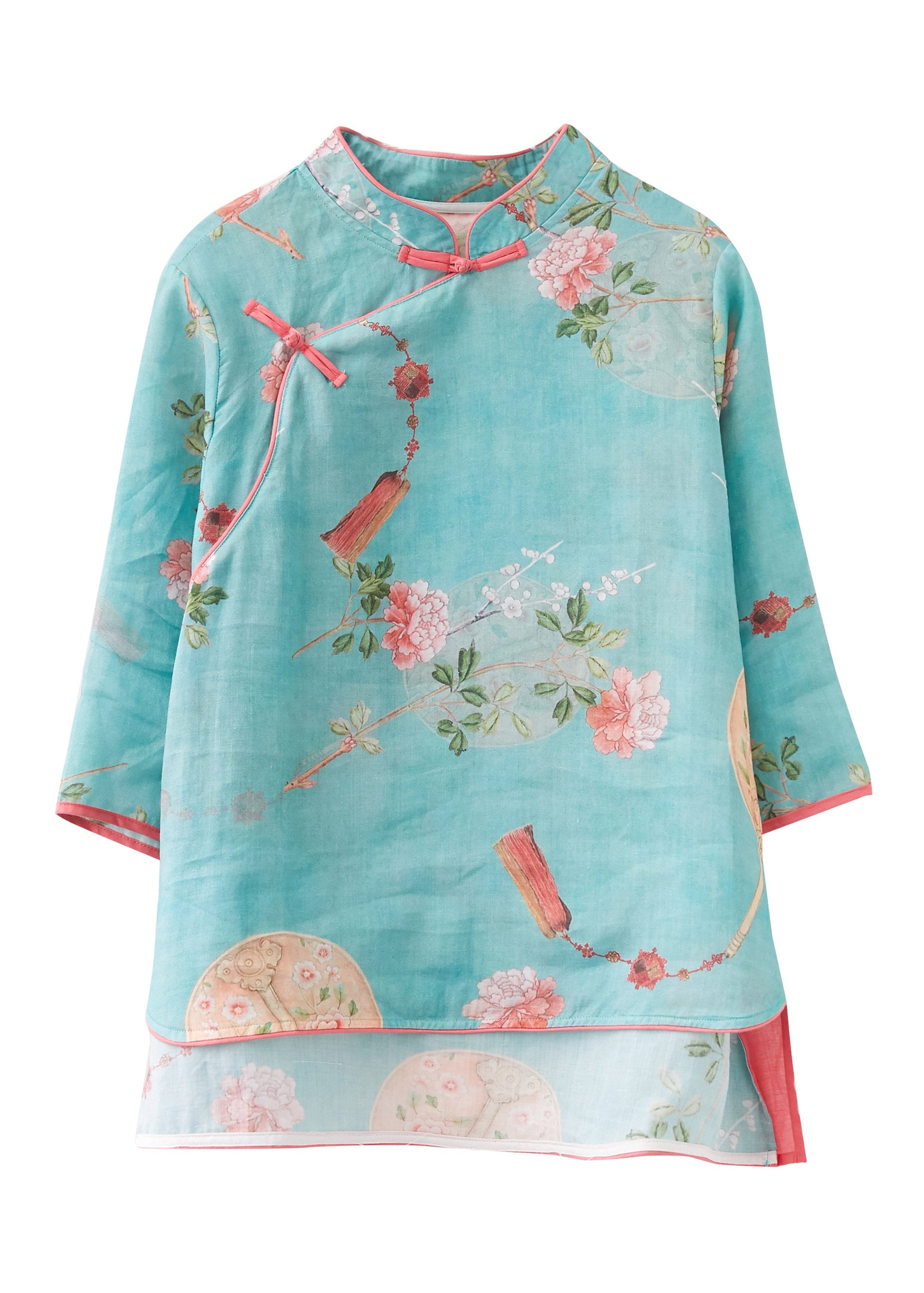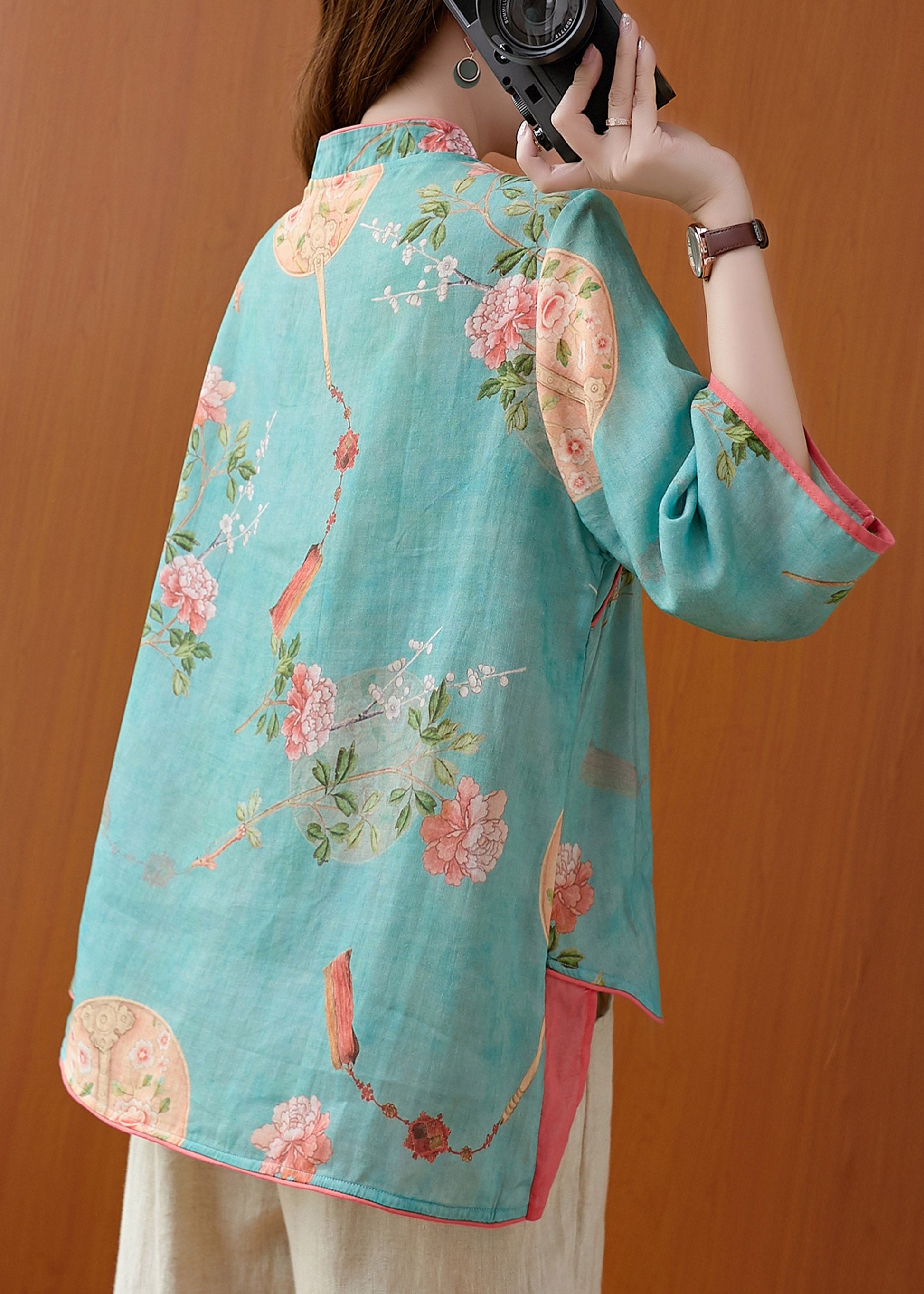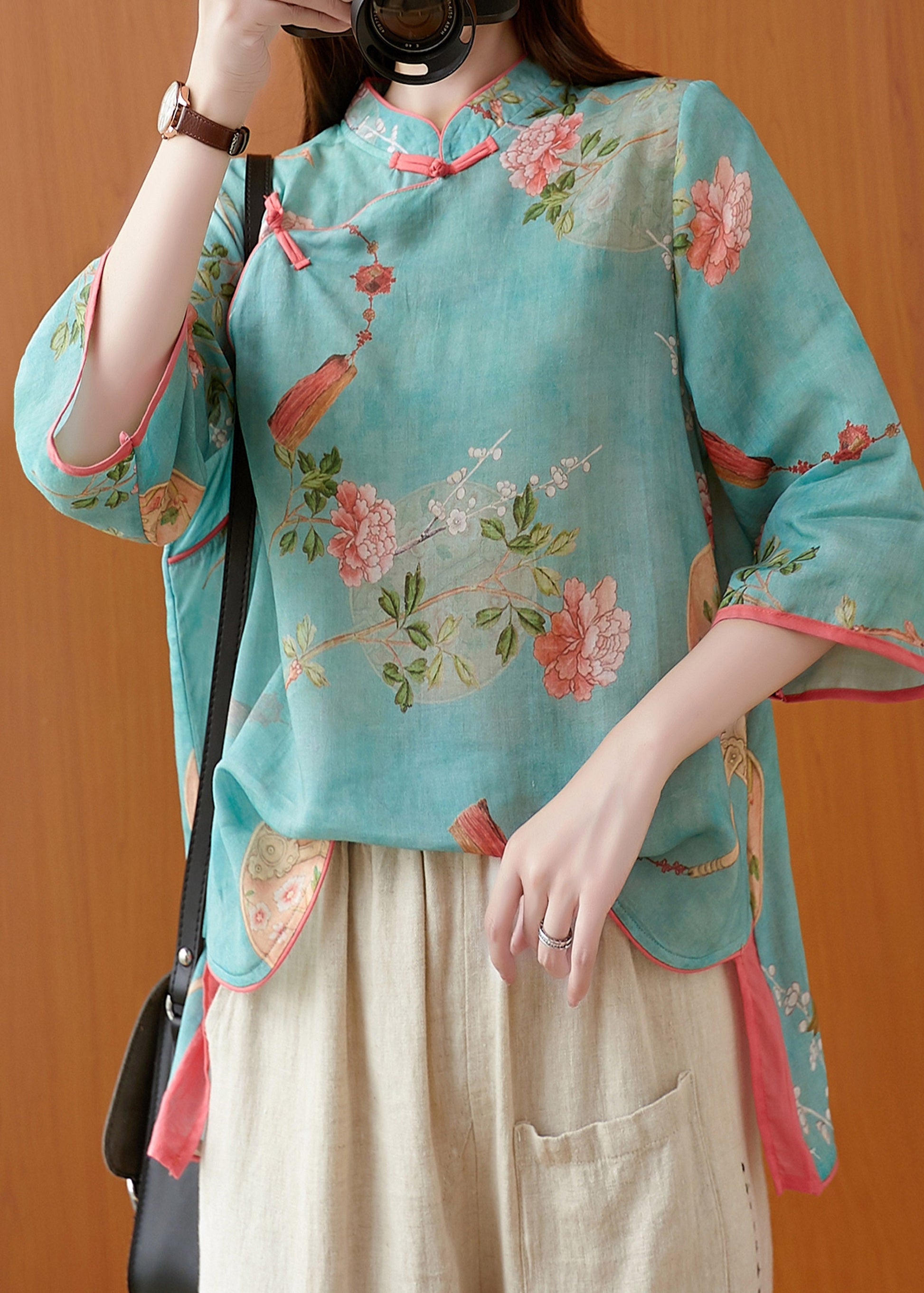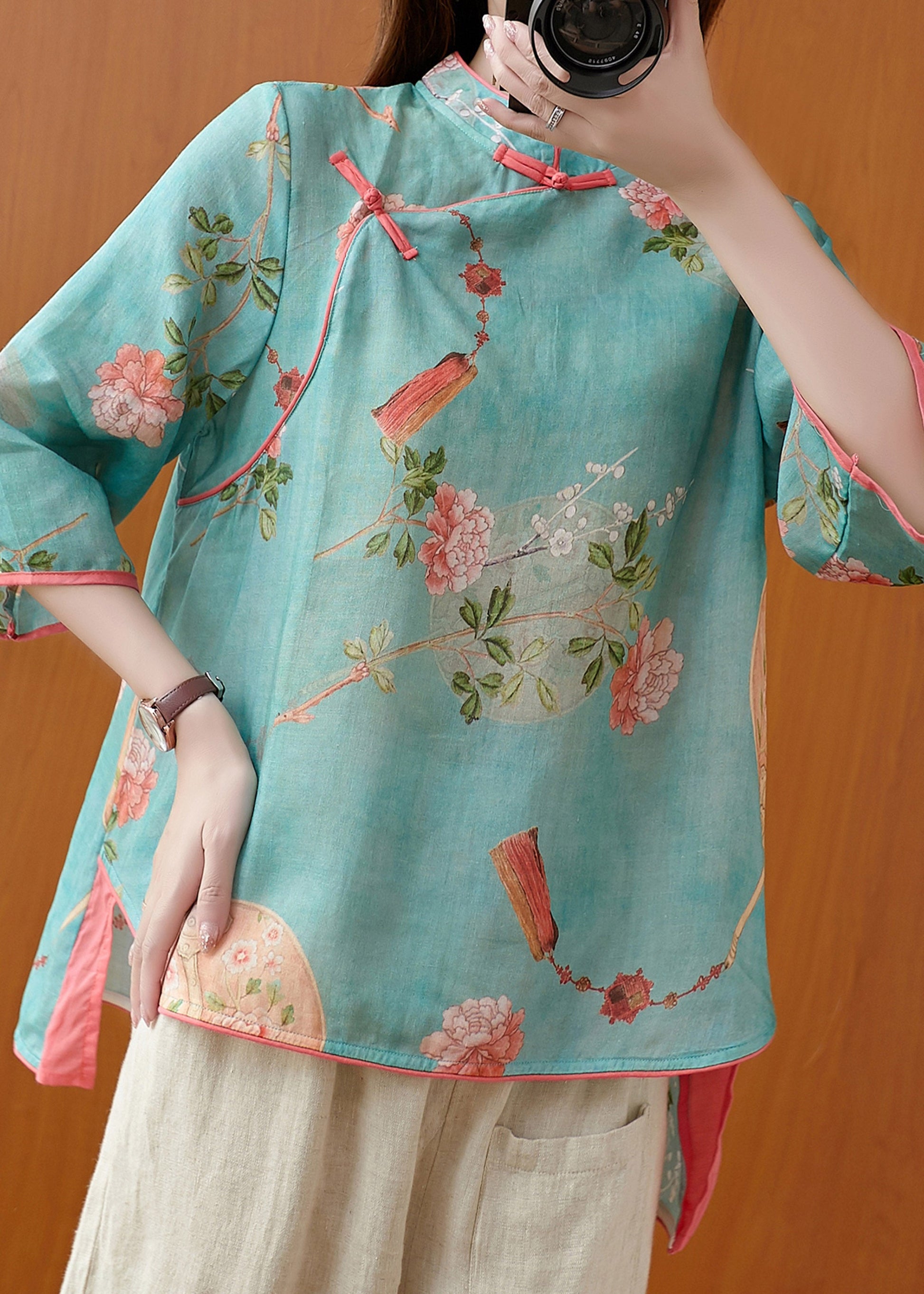 French Green Stand Collar low high design Print Linen Blouse Tops Spring