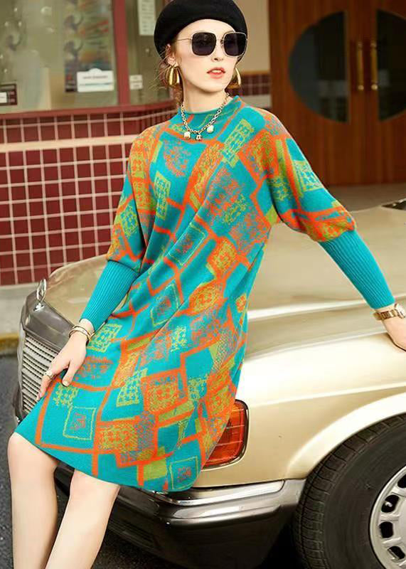 Green Jacquard Patchwork Loose Woolen Dresses Stand Collar Winter