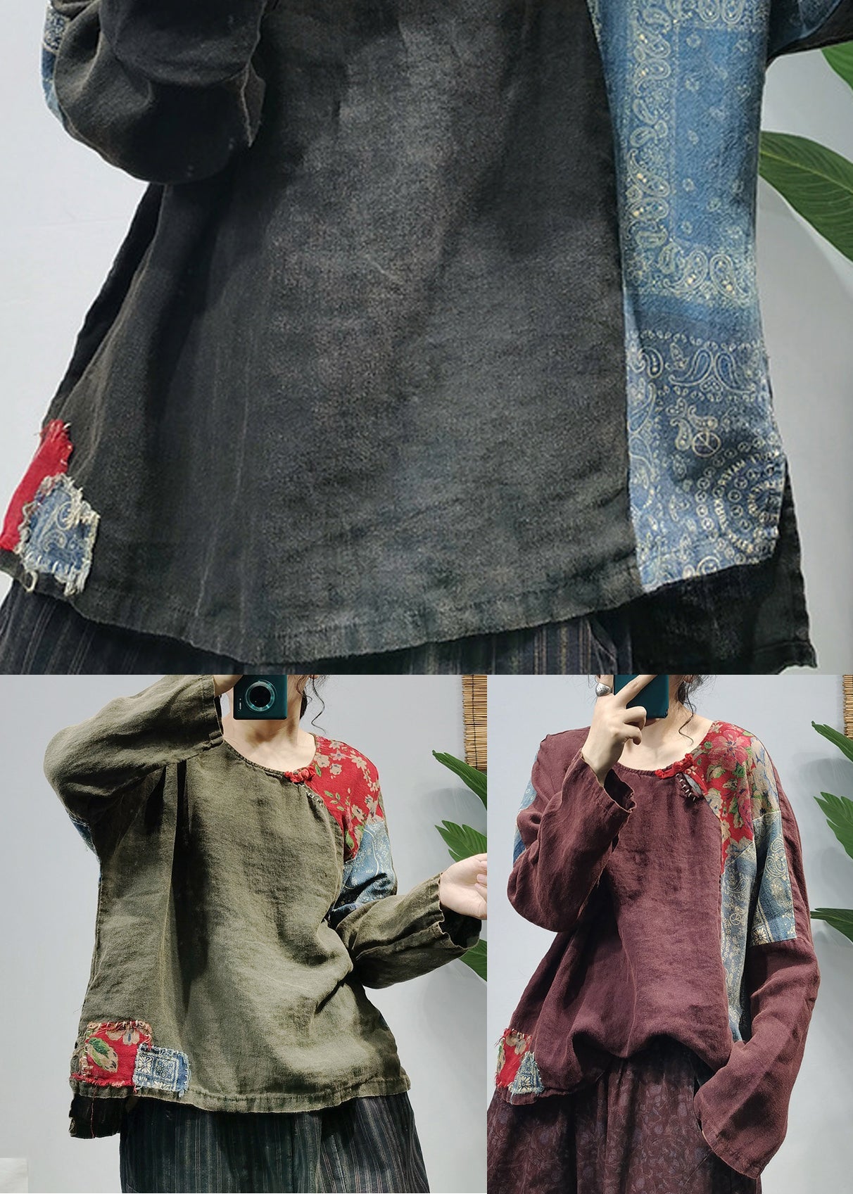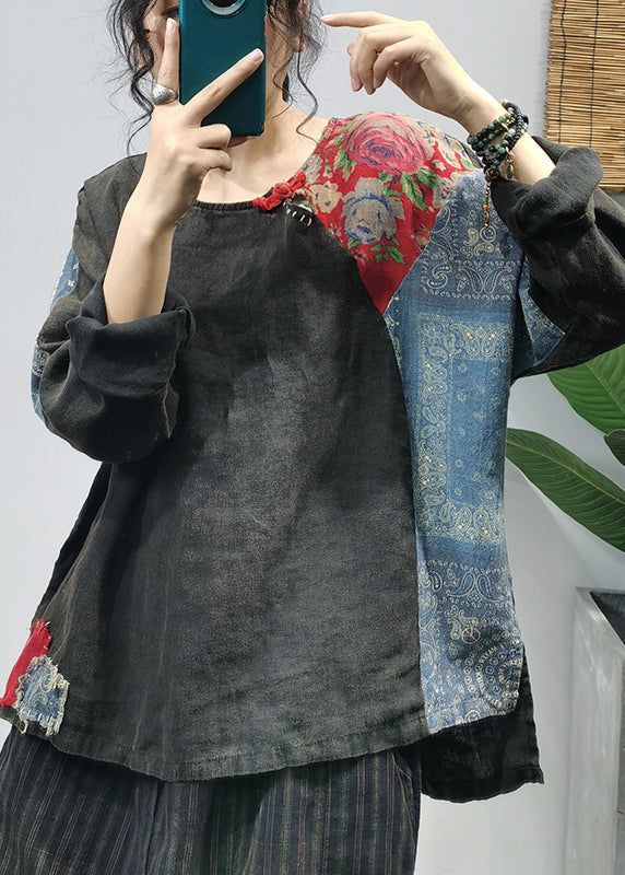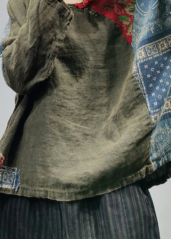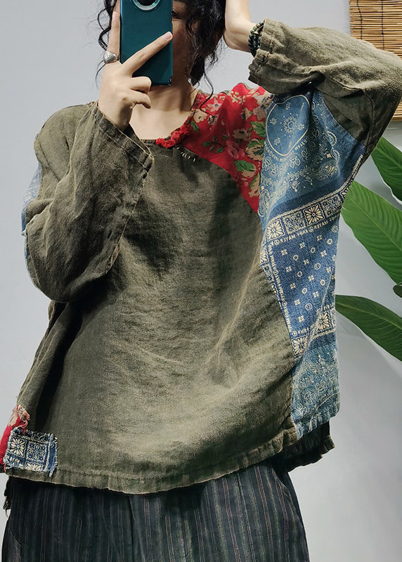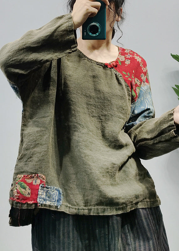 Green Print Linen Shirt Tops O-Neck Button Long Sleeve