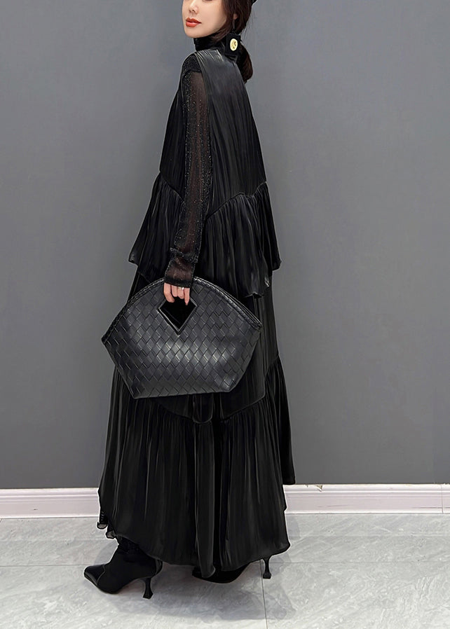 Italian Black Peter Pan Collar Wrinkled Button Satin Maxi Dresses Fall