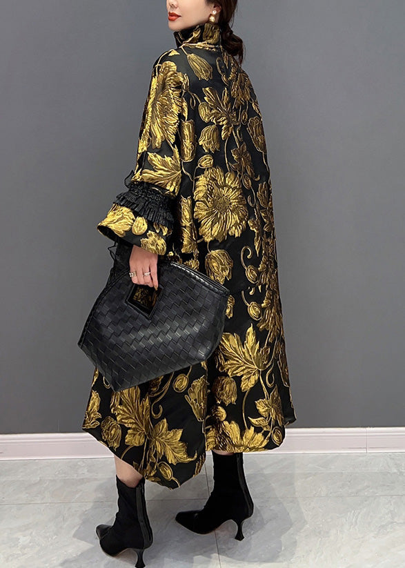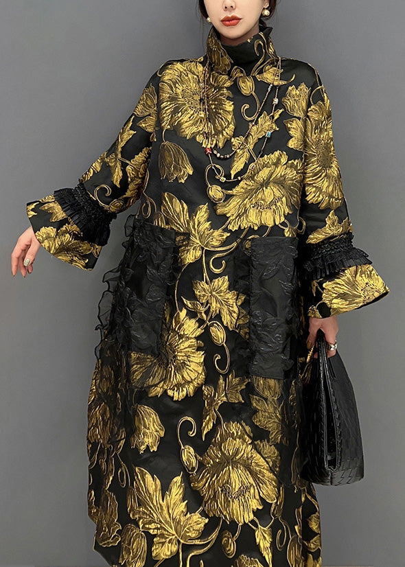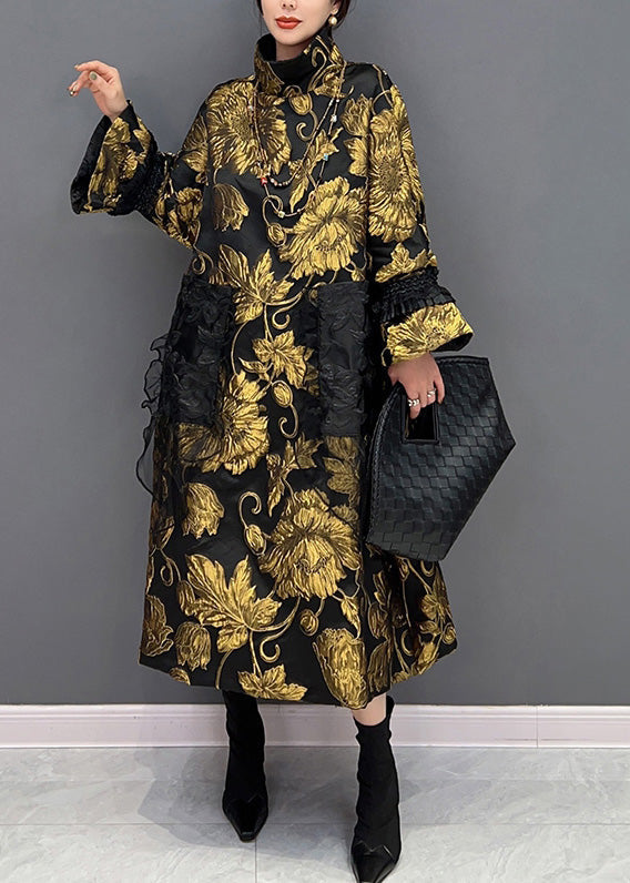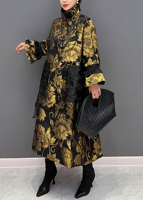 Jacquard Black Patchwork Yellow Tulle Button Thick Long Coats Winter