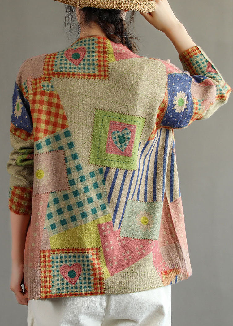 Khaki Print Mink Hair Knitted Cardigan V Neck Spring