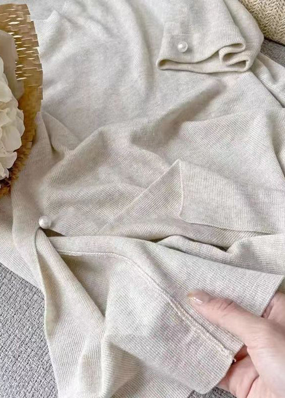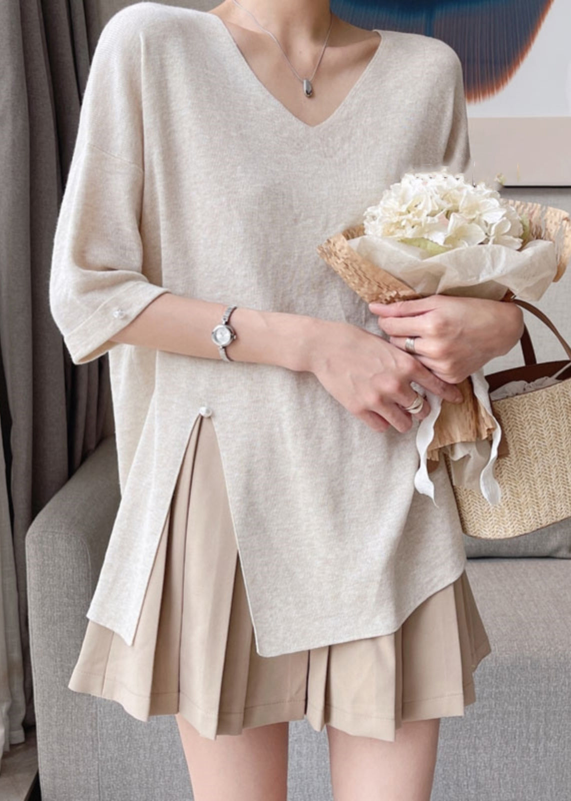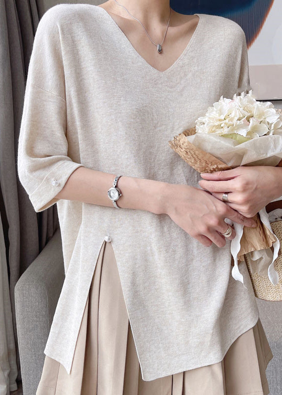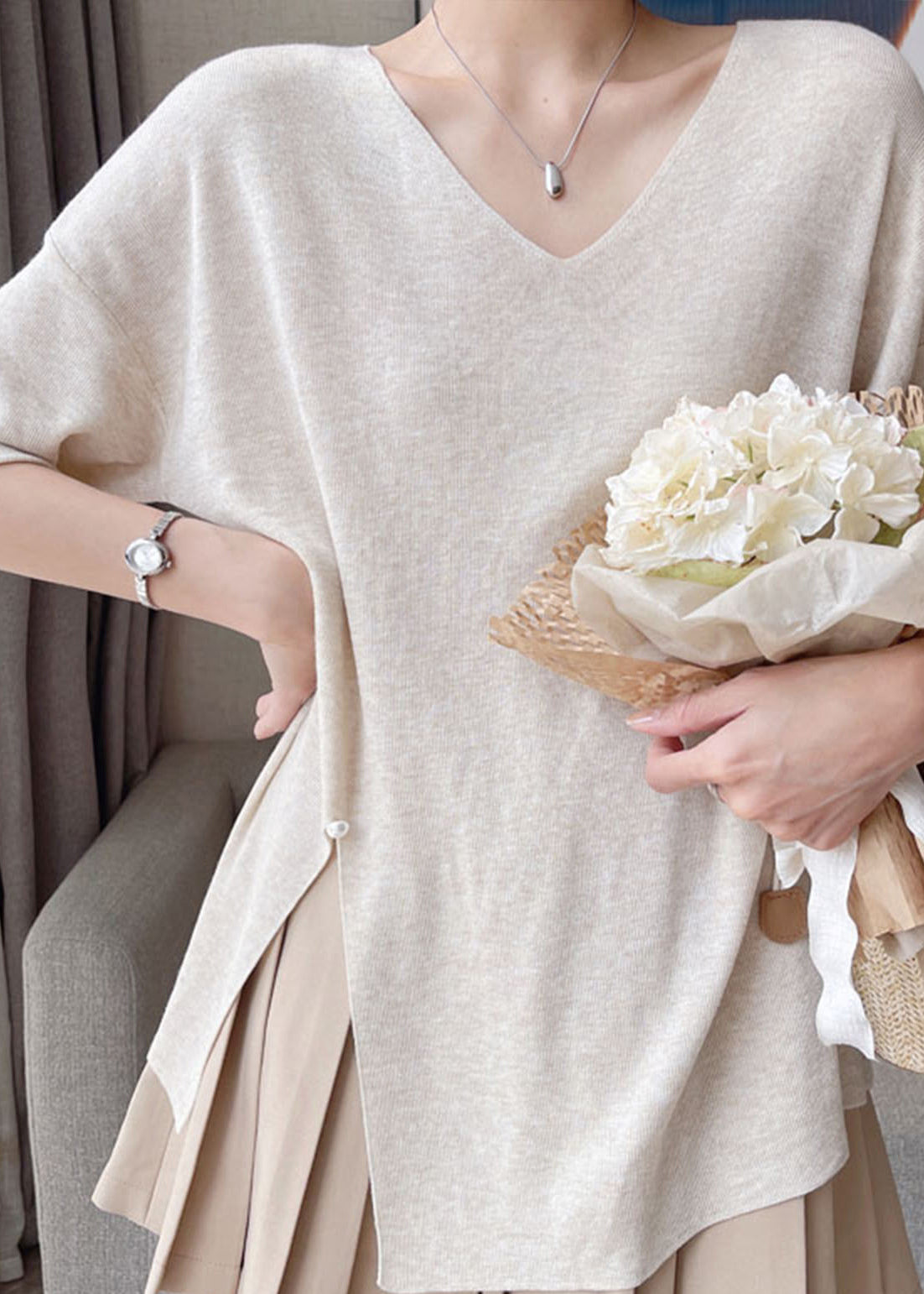Loose Apricot V Neck Side Open Patchwork Cotton Knit Top Half Sleeve
