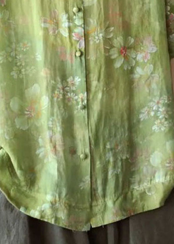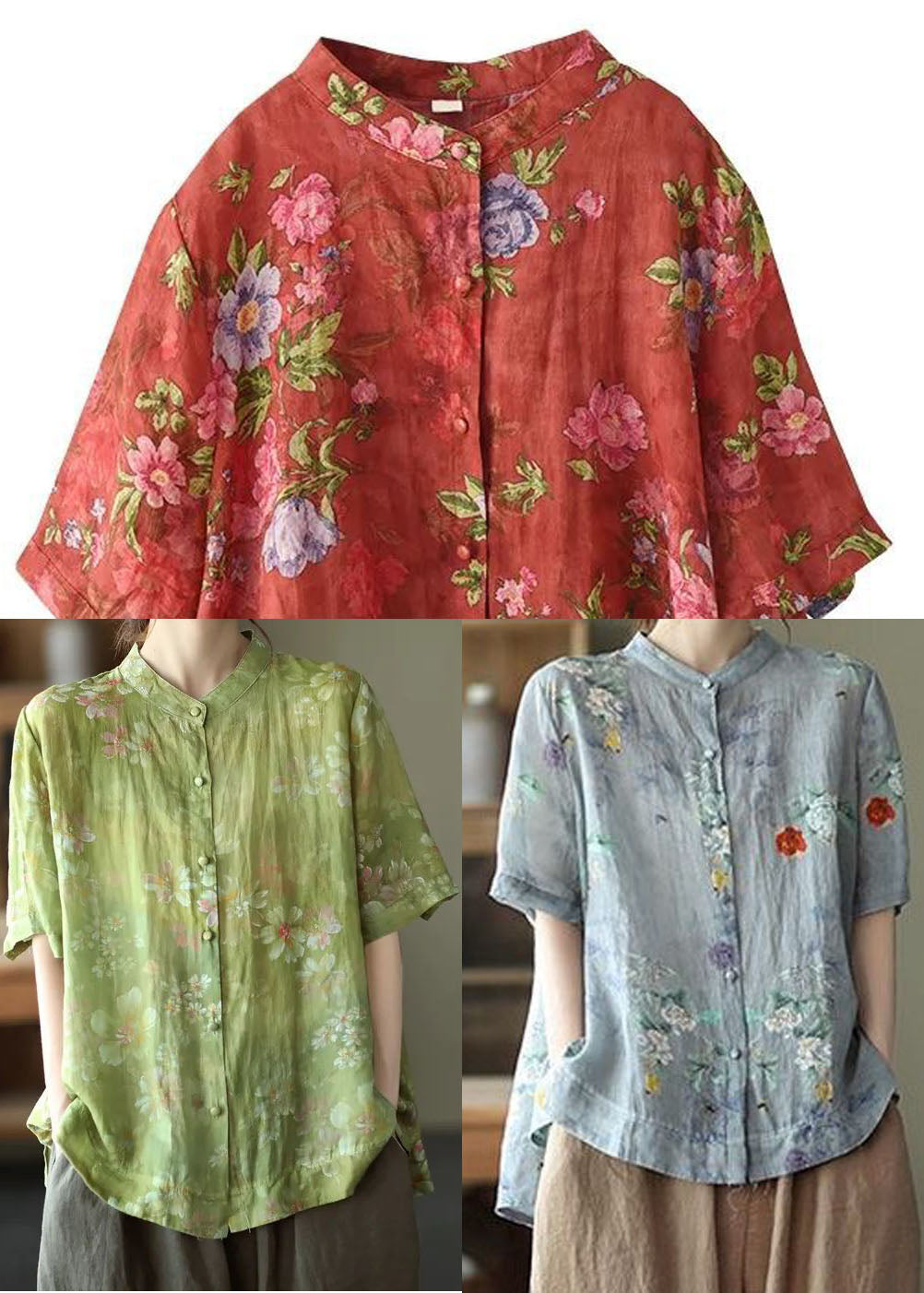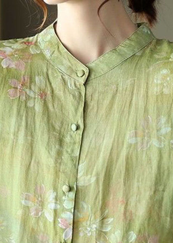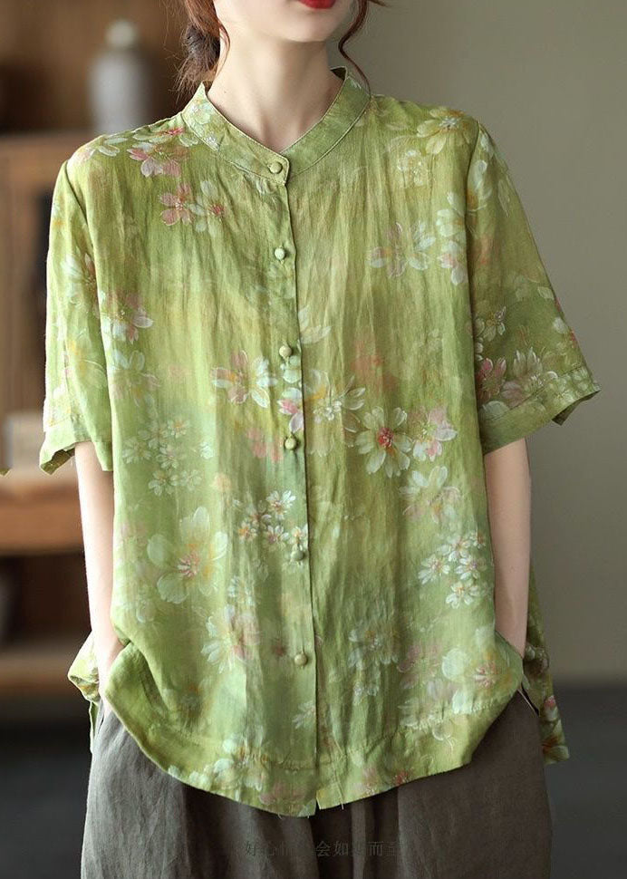 Loose Grass Green Stand Collar Print Button Cotton Top Short Sleeve