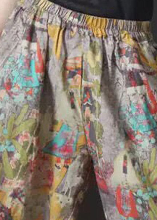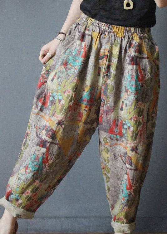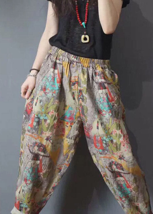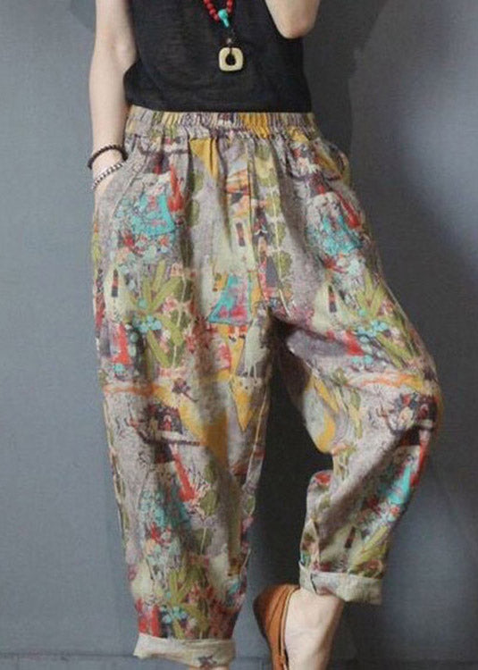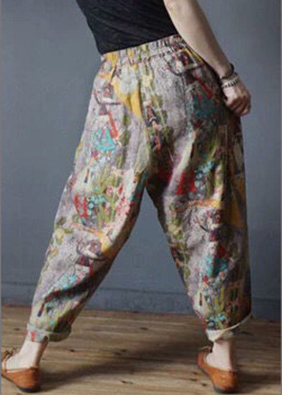 Loose Pockets Elastic Waist Print Linen Harem Pants Summer