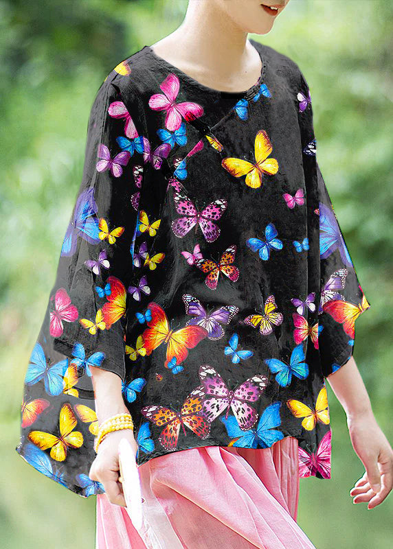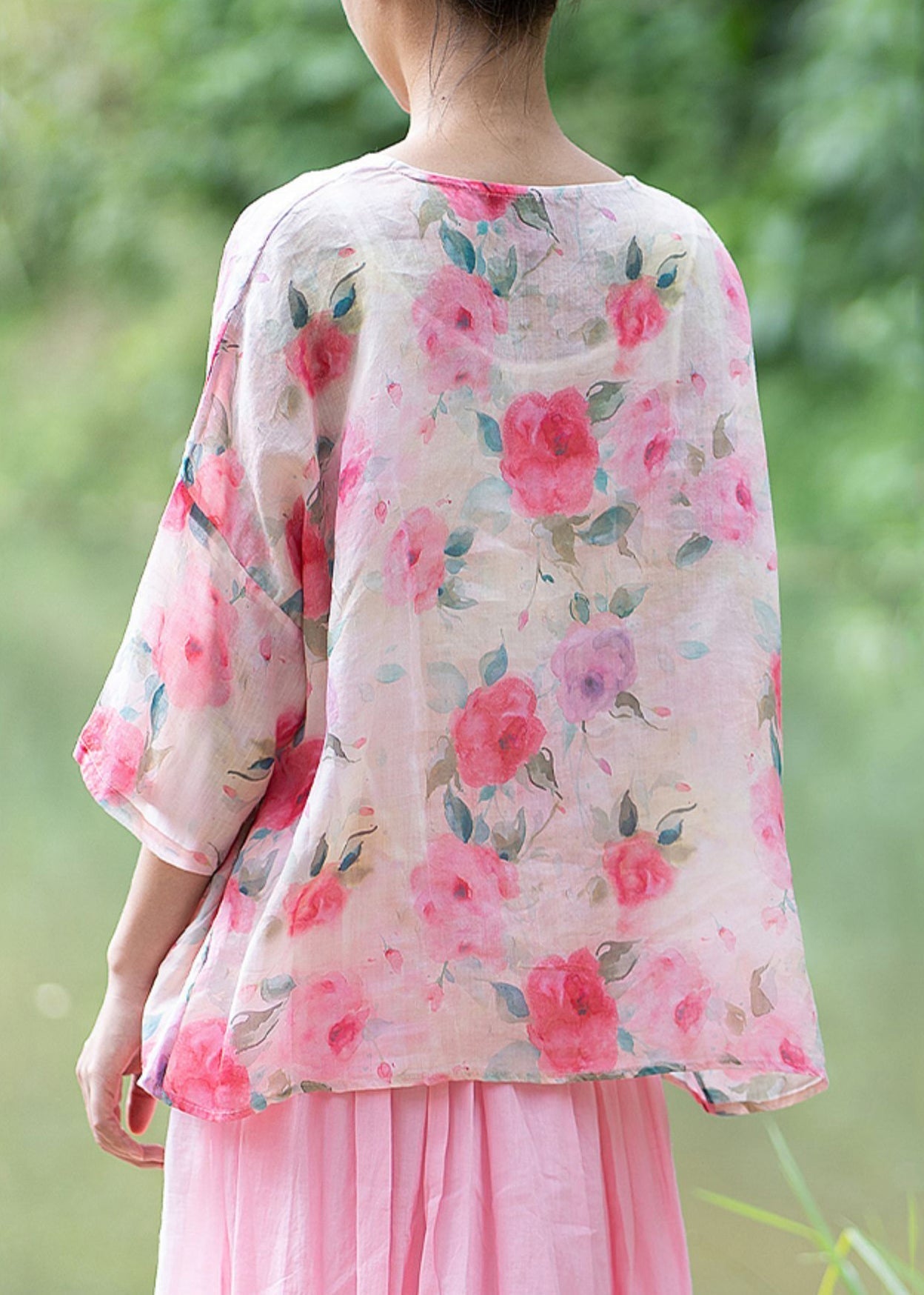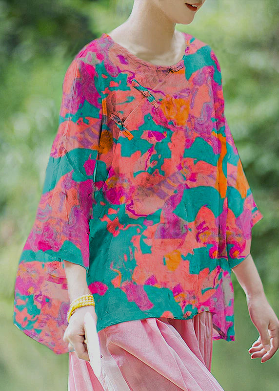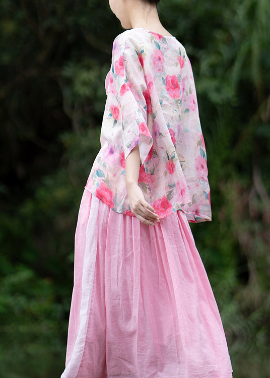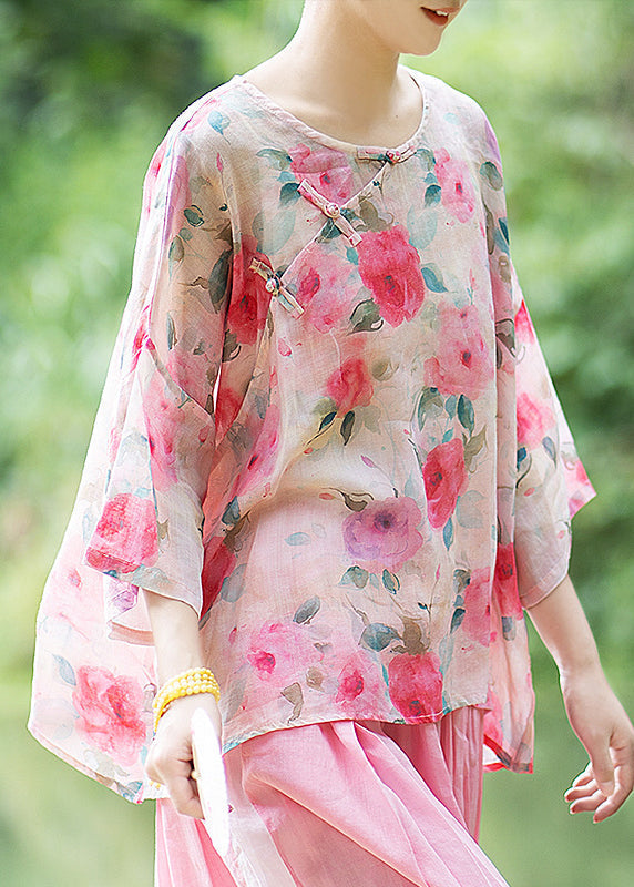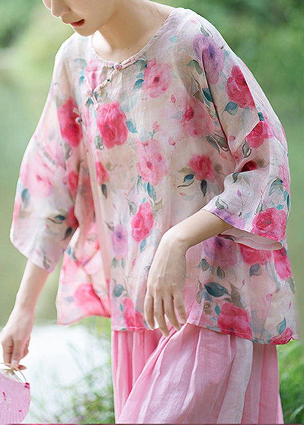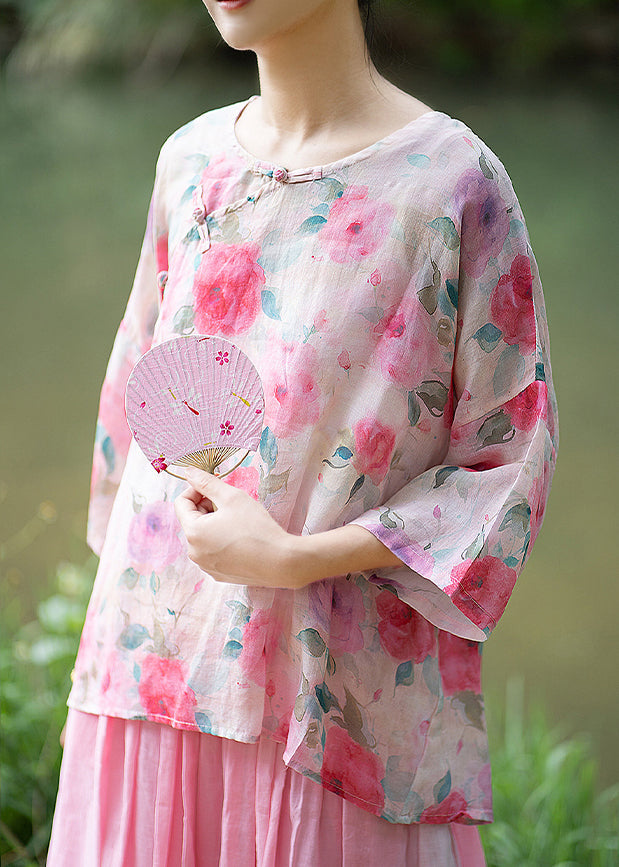 Natural Pink O Neck Print Chinese Button Linen Shirt Summer