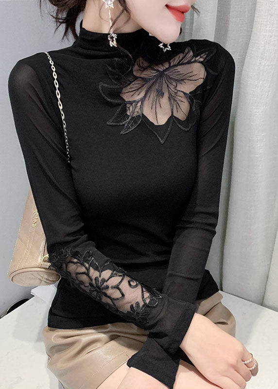 Plus Size Black Stand Collar tulle Patchwork tops Spring