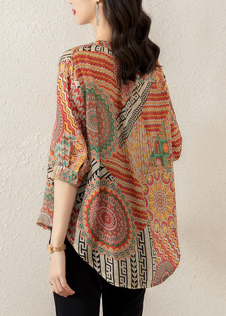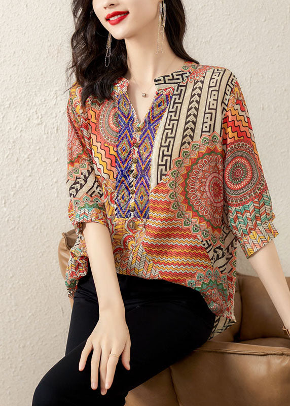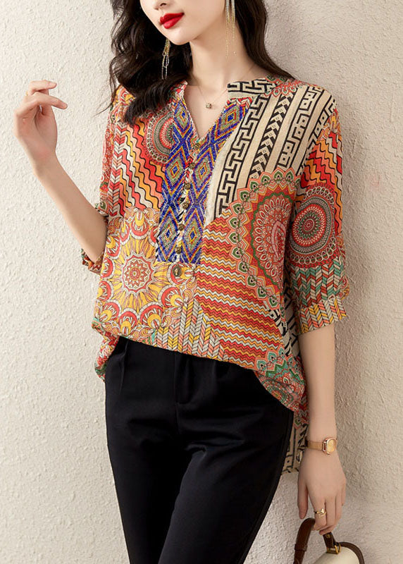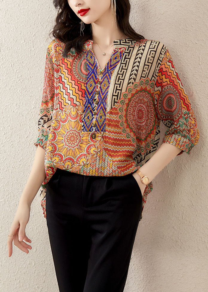 Plus Size Orange V Neck Print Patchwork Chiffon T Shirt Tops Summer
