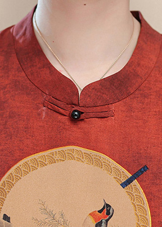 Plus Size Red O-Neck Print Side Open Silk Top Half Sleeve