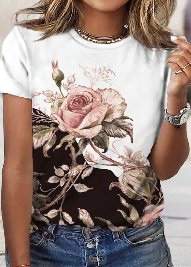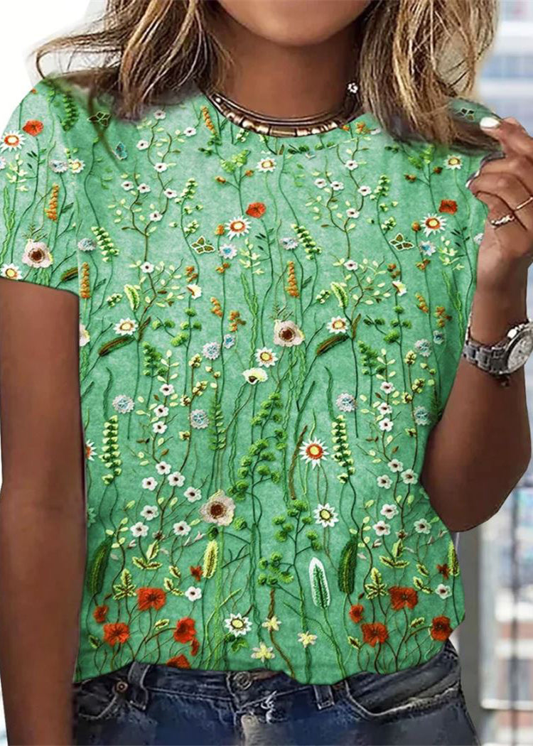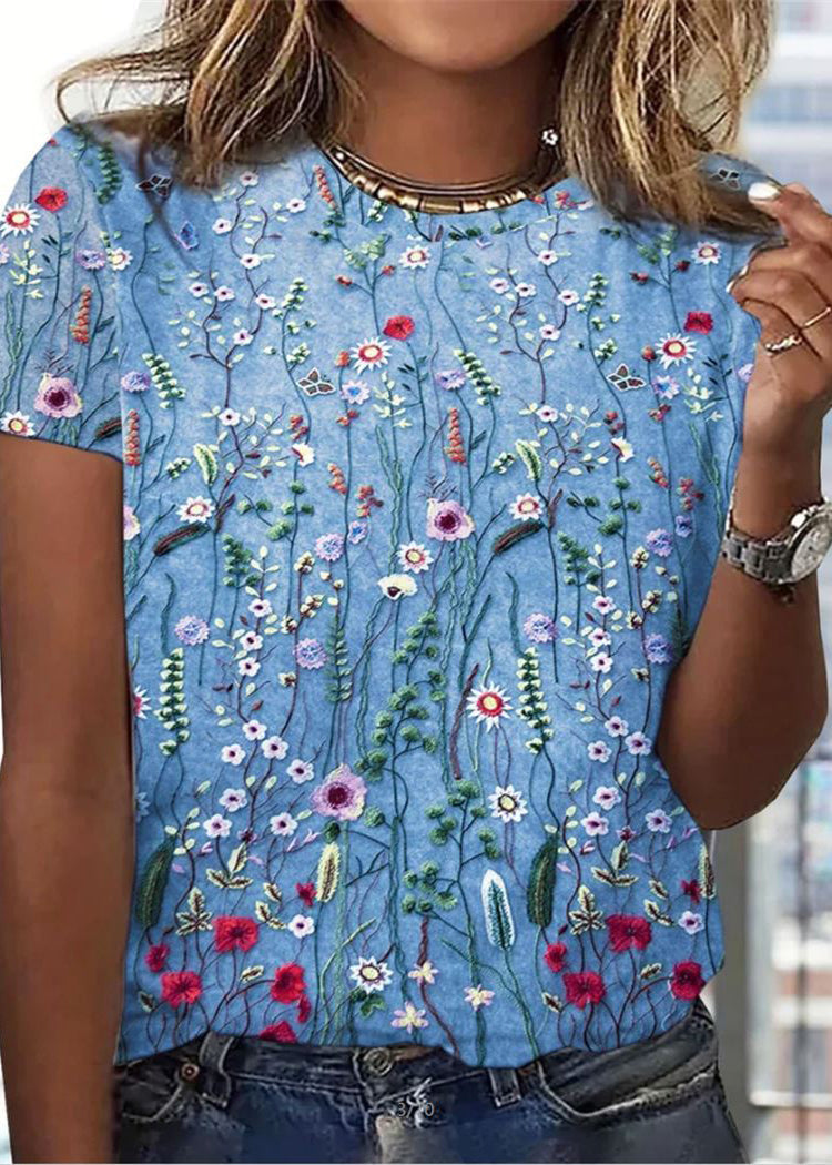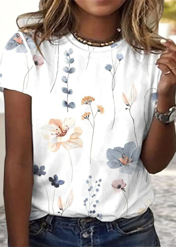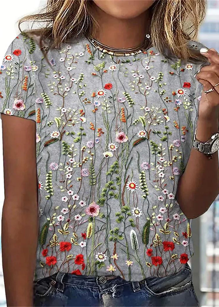 Short Sleeve T Neck Casual Flower Loose T Shirt Women Grey