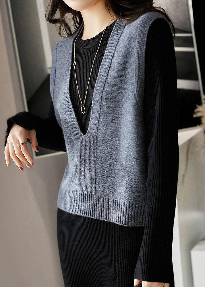 Simple Dark Gray V Neck Patchwork Knit Waistcoat Sleeveless