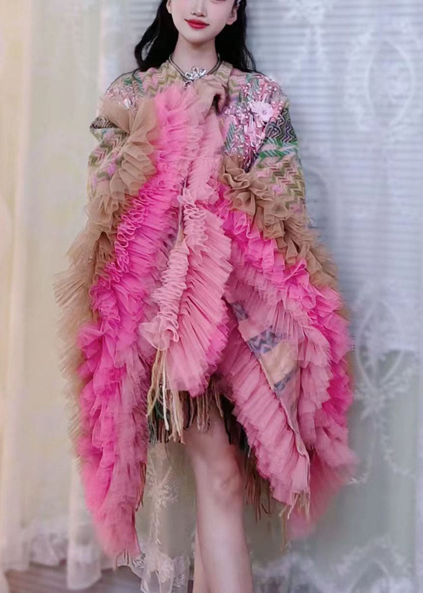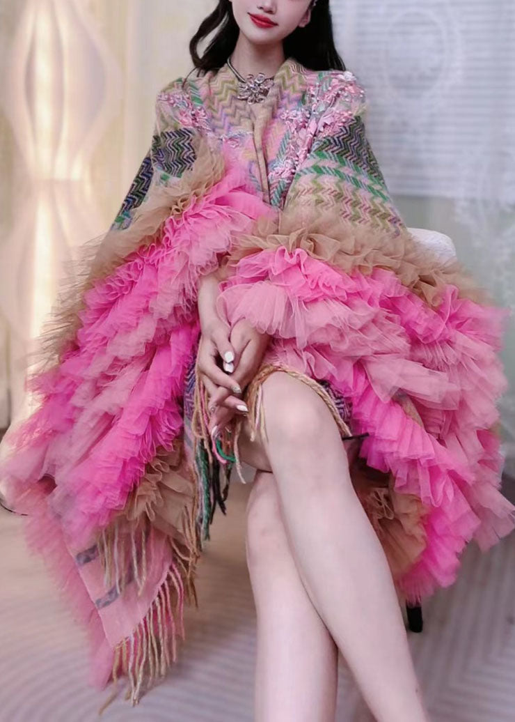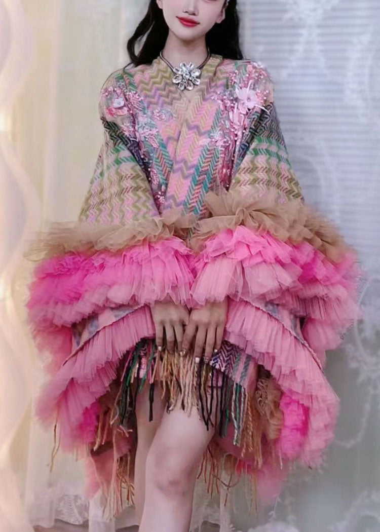 Style Brown Print Tassel Tulle Patchwork Knit Vacation Mid Cape Dresses Long Sleeve
