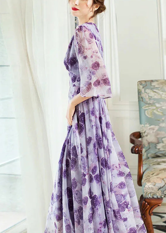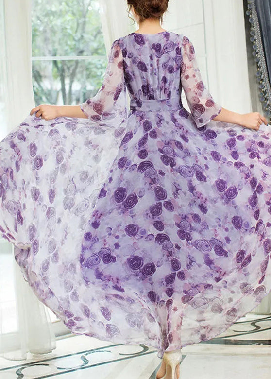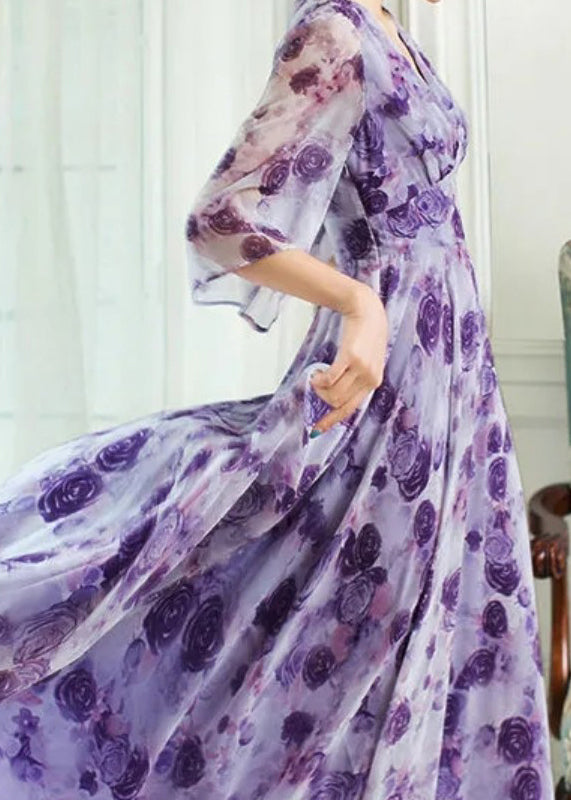 Style Purple V Neck Print Slim Chiffon Vacation Maxi Dresses Spring