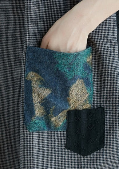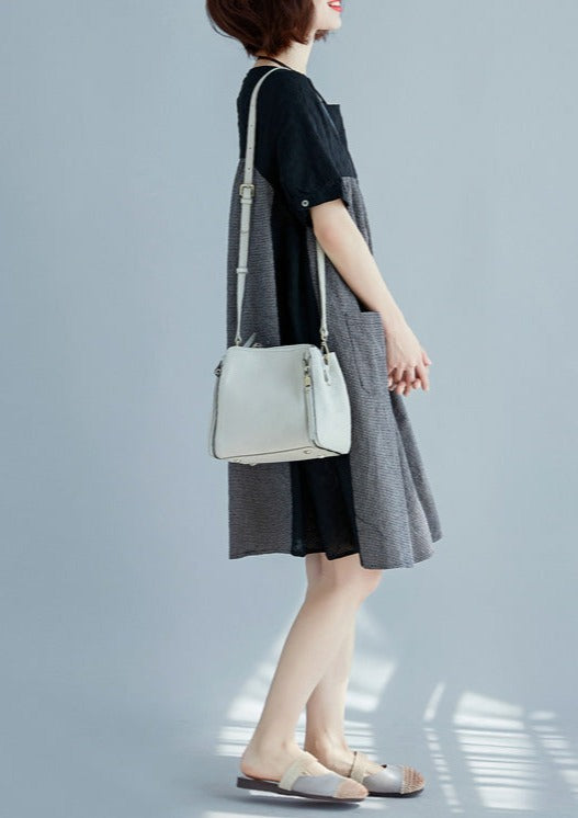 stylish black natural cotton linen dress Loose fitting short sleeve pockets holiday dresses 2018 o neck patchwork cotton linen dresses