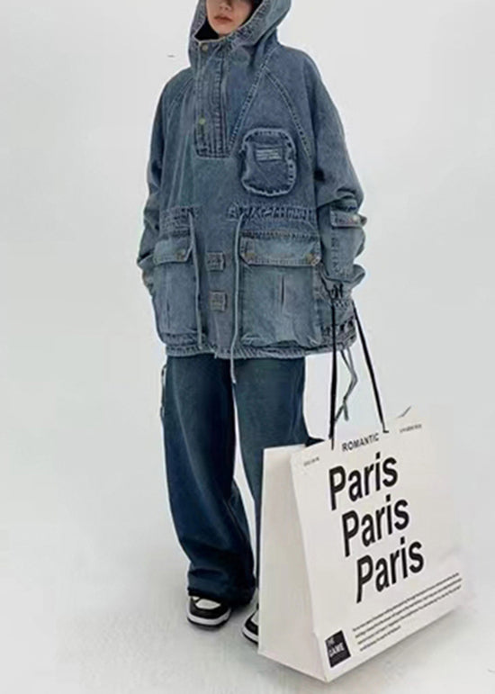 Stylish Blue Hooded Pockets Drawstring Patchwork Denim Top Fall