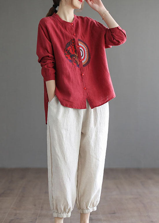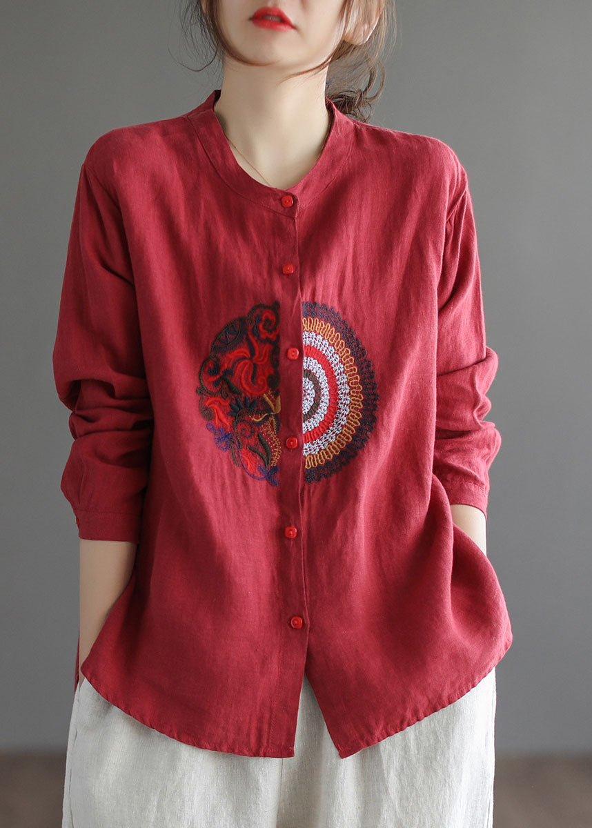 Stylish Red O-Neck Button Linen Blouses top Long Sleeve