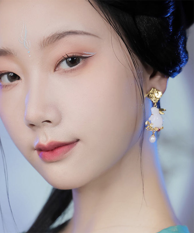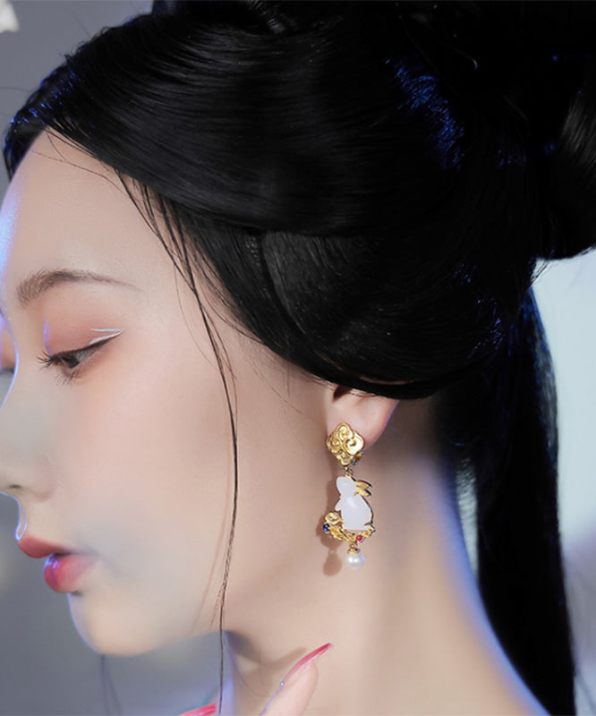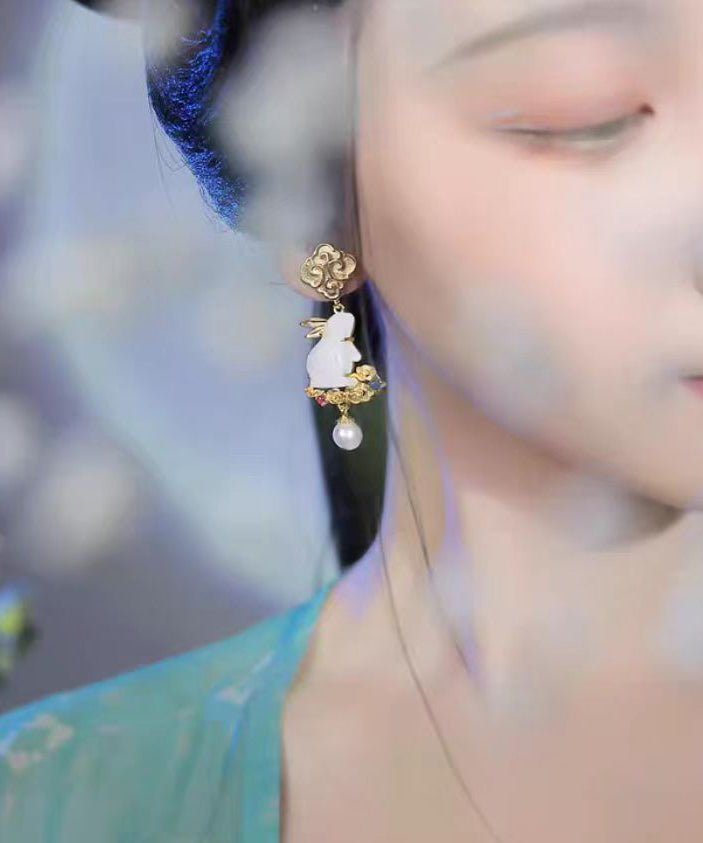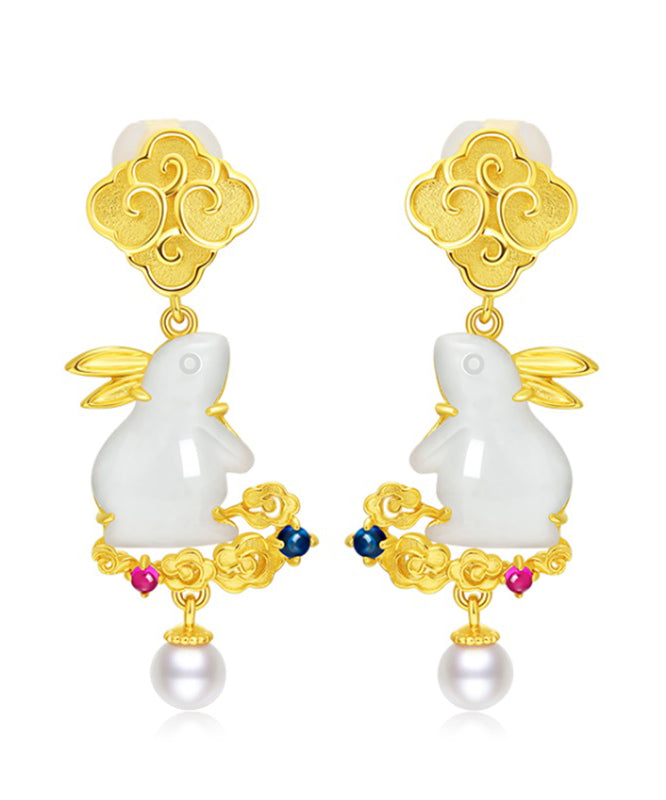 Stylish Yellow Sterling Silver Overgild Jade Pearl Xiangyun The Jade Hare Drop Earrings