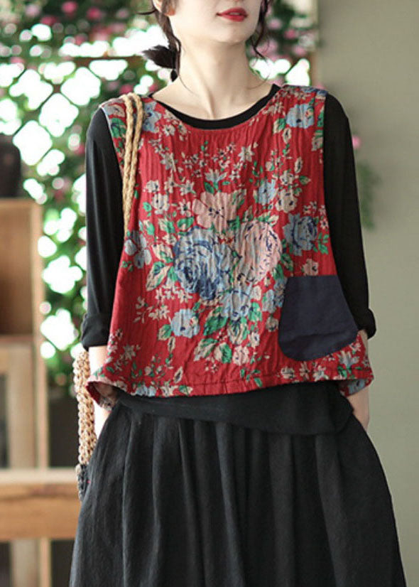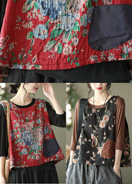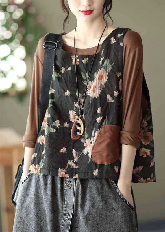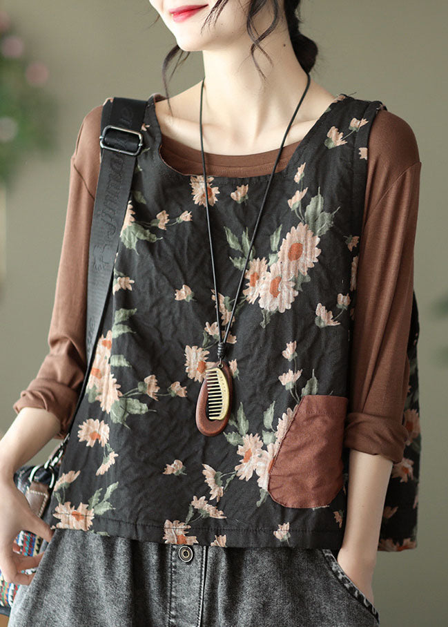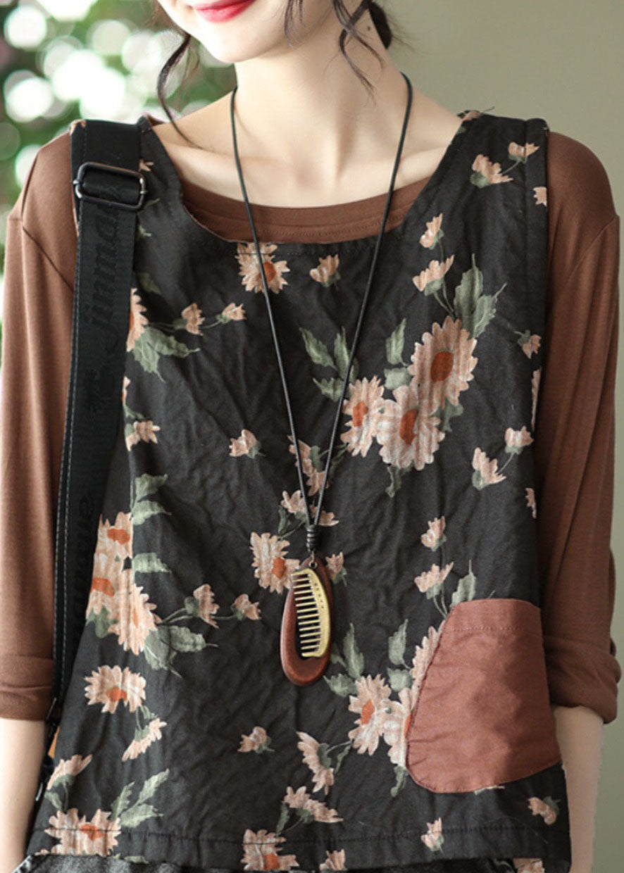 Unique Black O-Neck Print Linen Vest Sleeveless