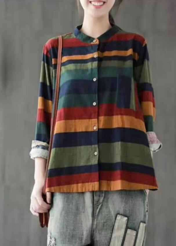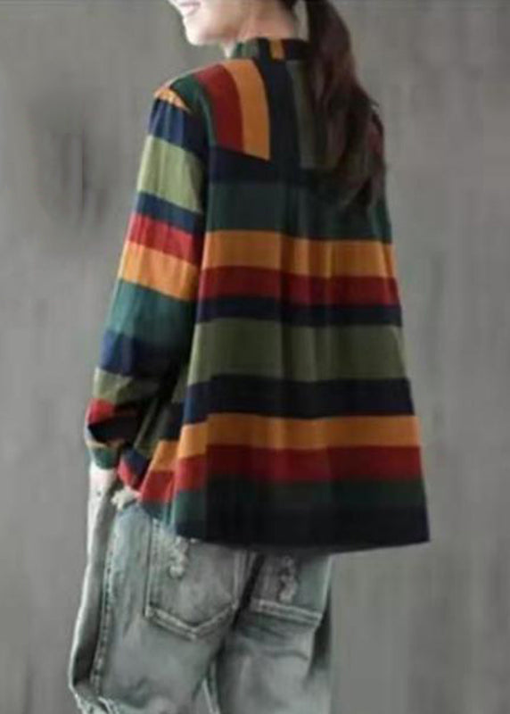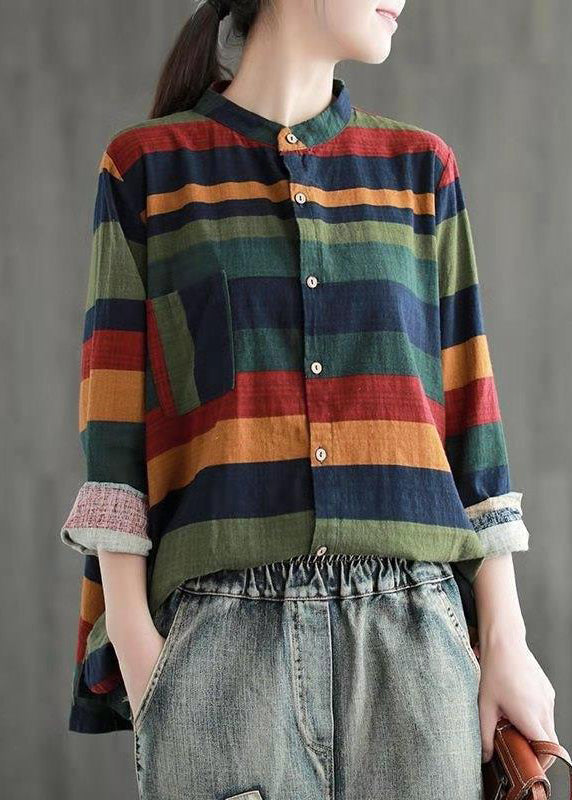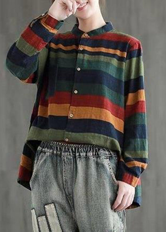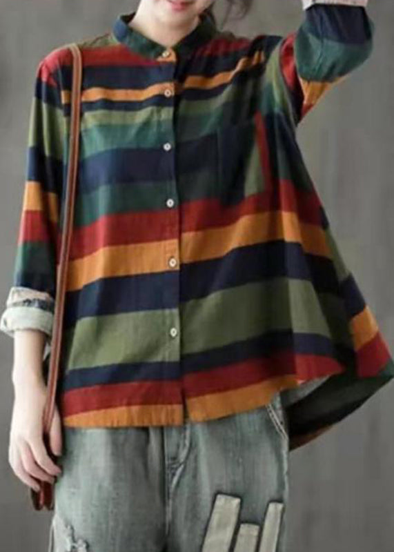 Unique Colorblock Stand Collar low high design button Striped Shirts Long Sleeve