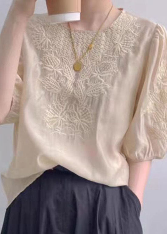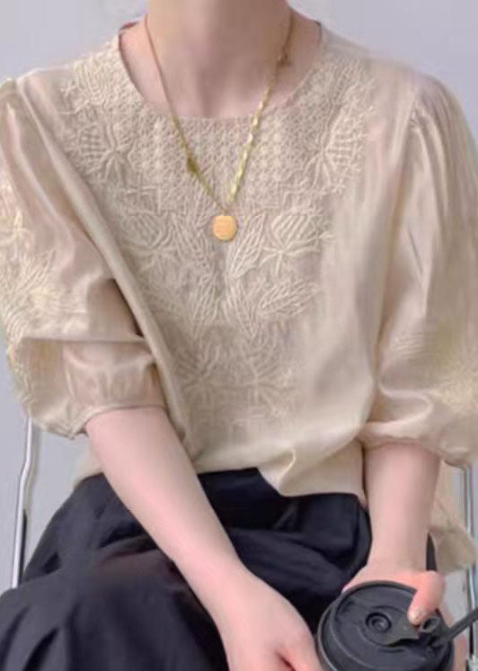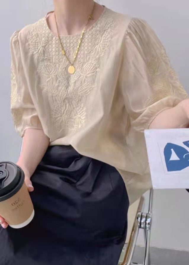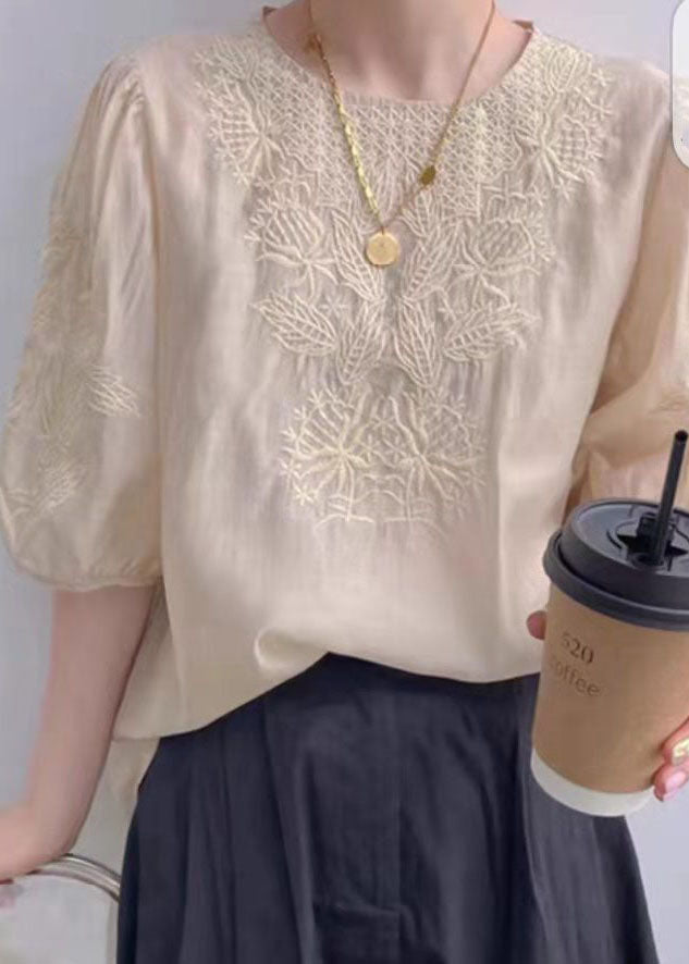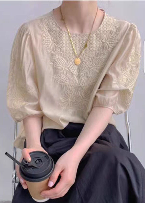 Vintage Apricot O-Neck Embroideried Silk Top Puff Sleeve
