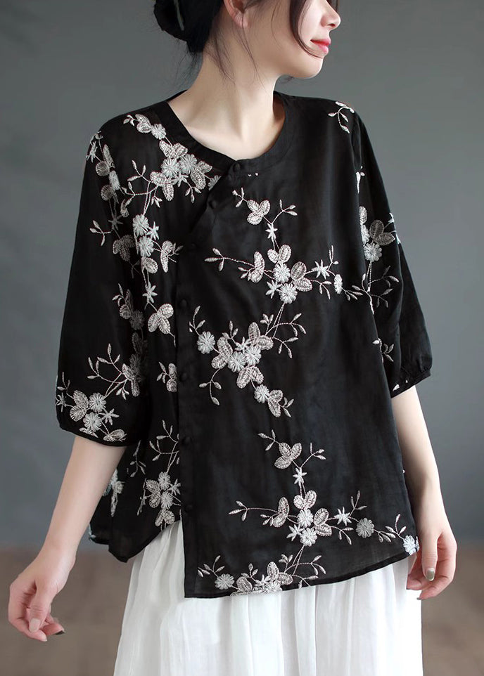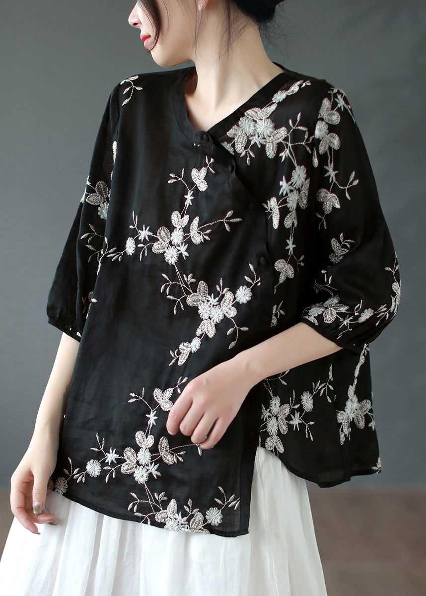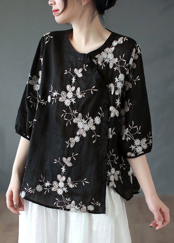 Vintage Black Asymmetrical Button Patchwork Linen Shirt Summer
