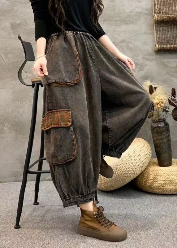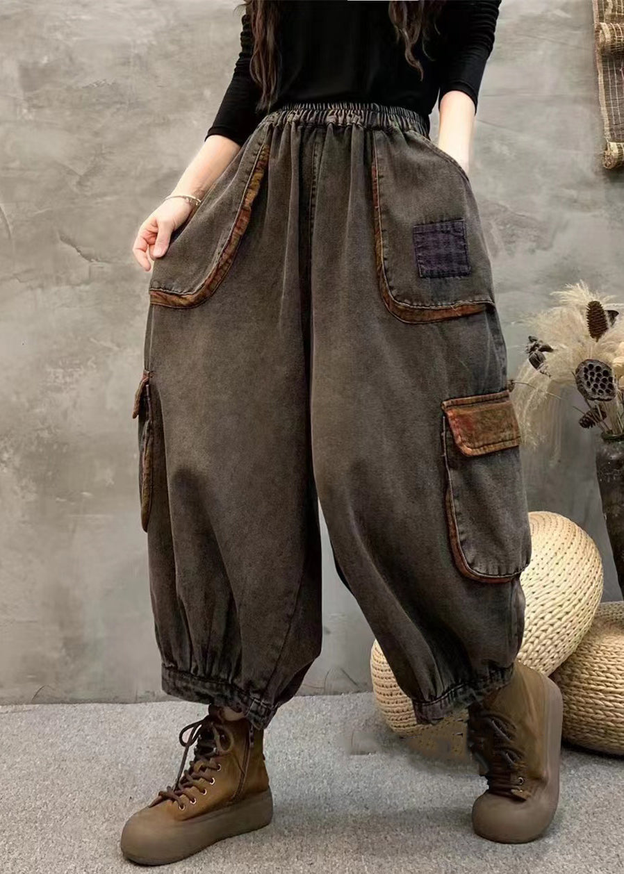 Vintage Black Pockets Elastic Waist Patchwork Denim Harem Pants Fall