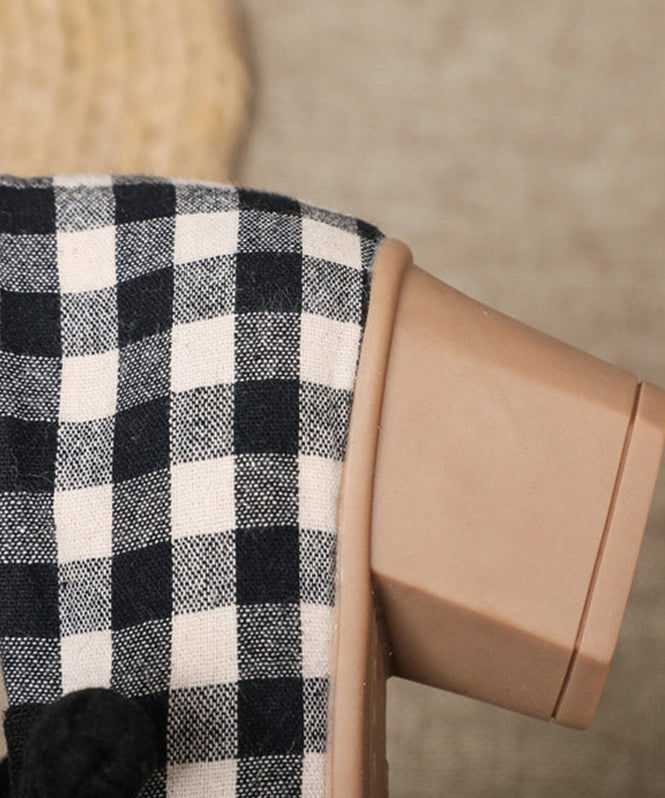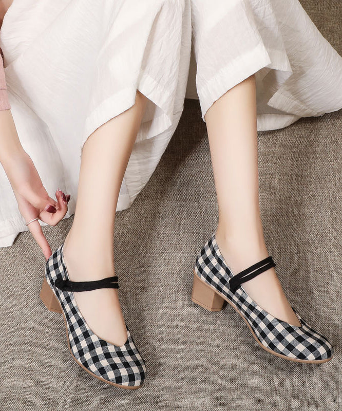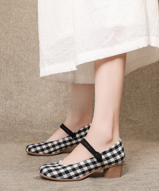 Vintage Buckle Strap Chunky High Heels Plaid Cotton Fabric