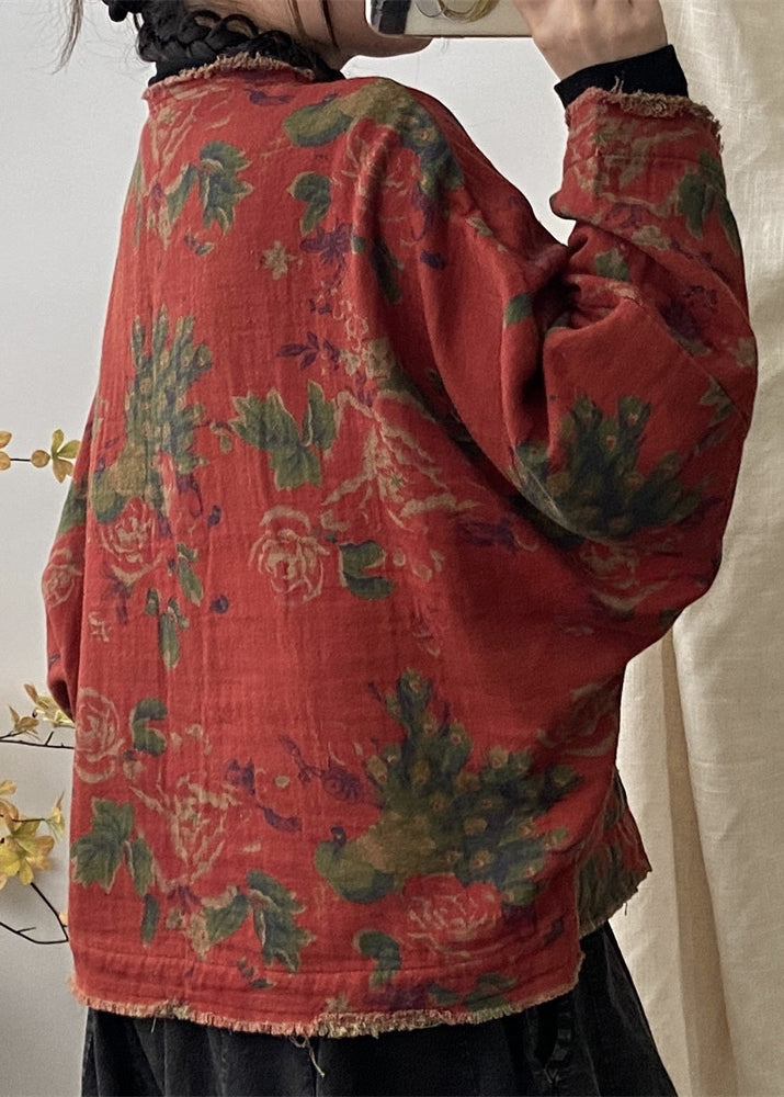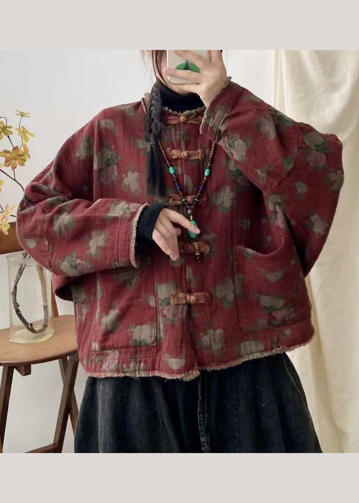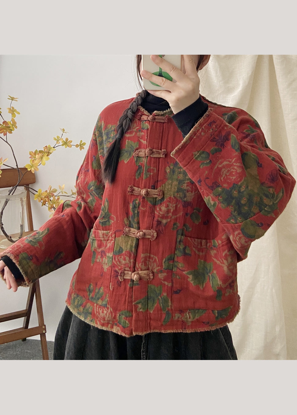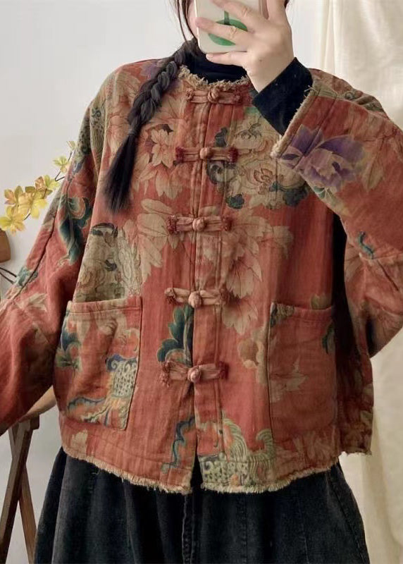 Vintage Orange Print Pockets Chinese Button Patchwork Cotton Coat Fall