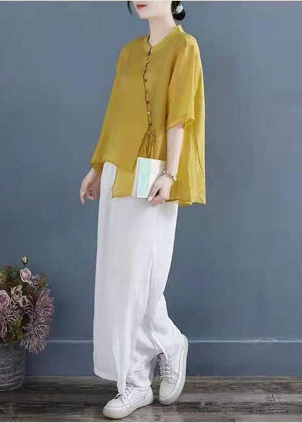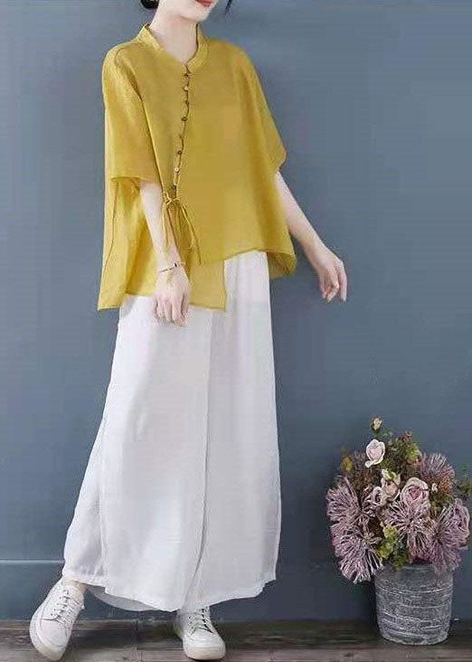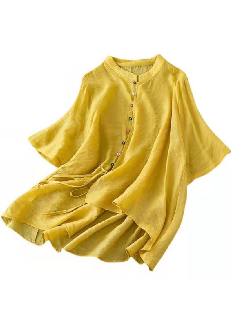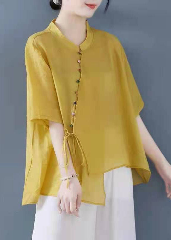 Vintage Yellow Solid Stand Collar Asymmetrical Design Shirt Top Half Sleeve