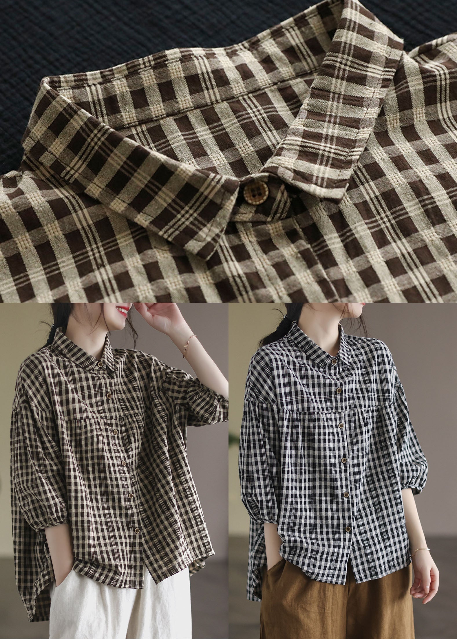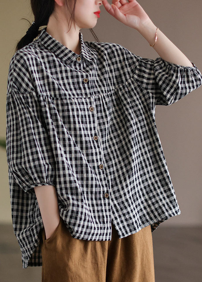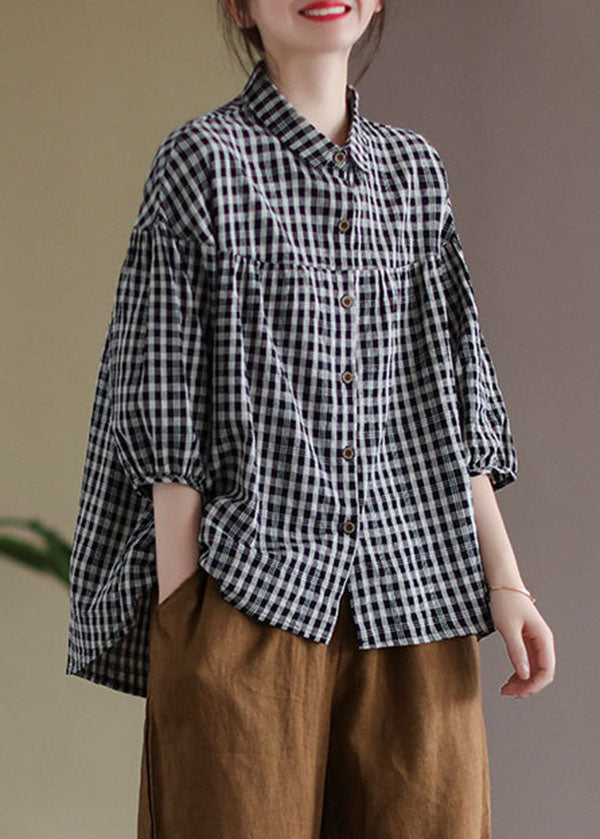 Women Black Peter Pan Collar Plaid Linen Shirt Half Sleeve